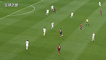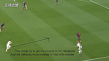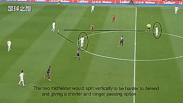 皇马开始试图从边路打开缺口,两个中场纵向拉开,这样不仅让对手难以防守,还提供了远近两种不同的传球选择,其中一个前锋回撤协助组织;
