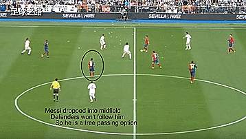 梅西换到中场,后卫没有盯他,他很快就成了一个无人防守的传球选择;