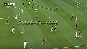 因为巴萨有三个中场而皇马有四个,所以远端的皇马中场一般无人盯防;