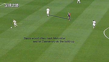 当卡纳瓦罗将球传到边后卫脚下的时候,巴萨边锋就会快速上前施压;