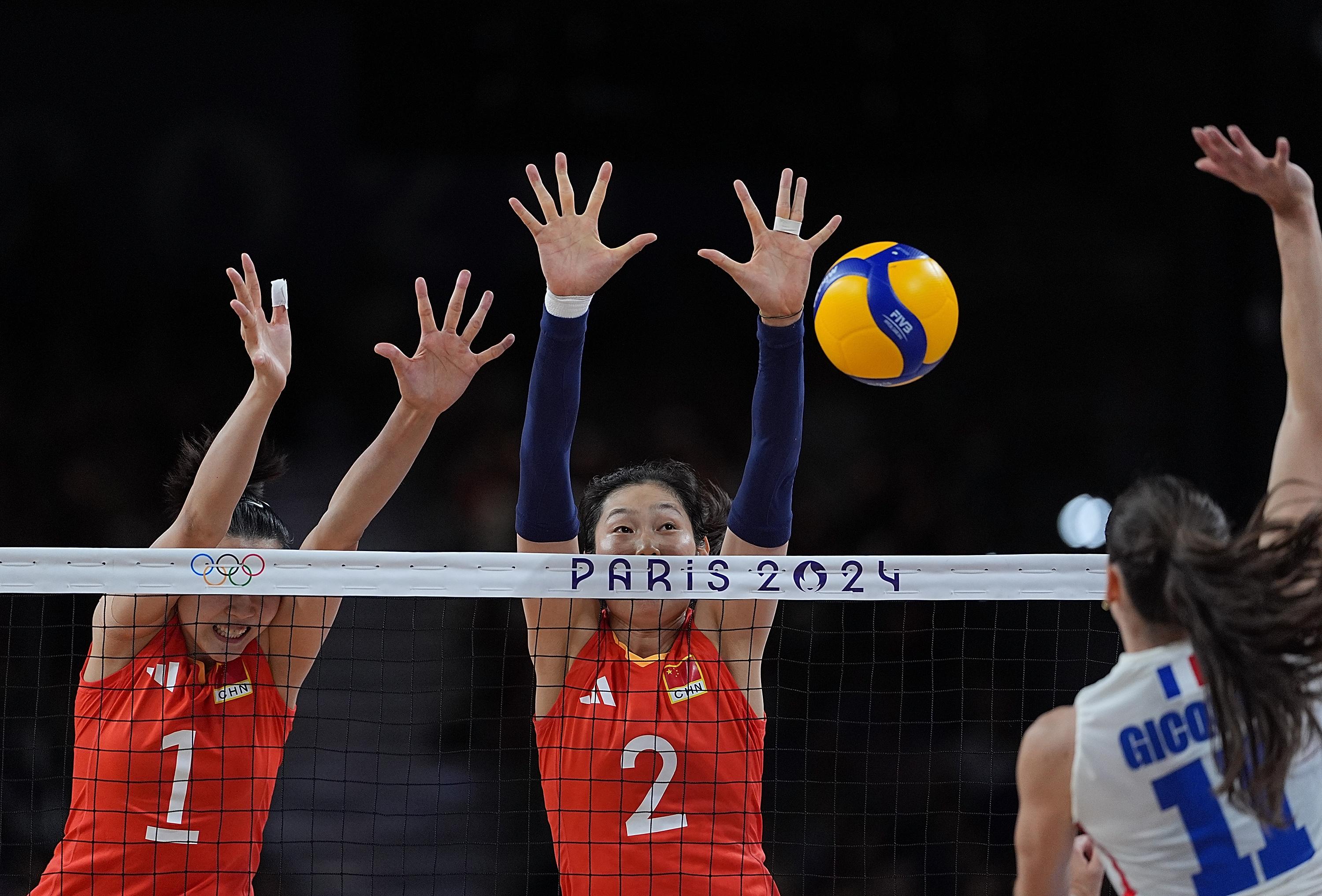 8月1日,中国队球员朱婷(中)和袁心玥(左)在比赛中拦网。 新华社记者 鞠焕宗 摄