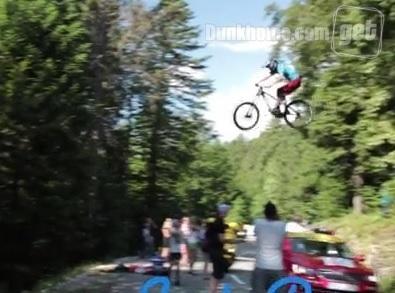 Encho Rage团队花费好几个月策划的飞坠表演,可能不像Dave Watson的招式那么有名, 山地车车手Romain Marandet从身着黄色领骑衫的环法积分领先的车手上方腾跃而过,在马路另一边成功着陆。