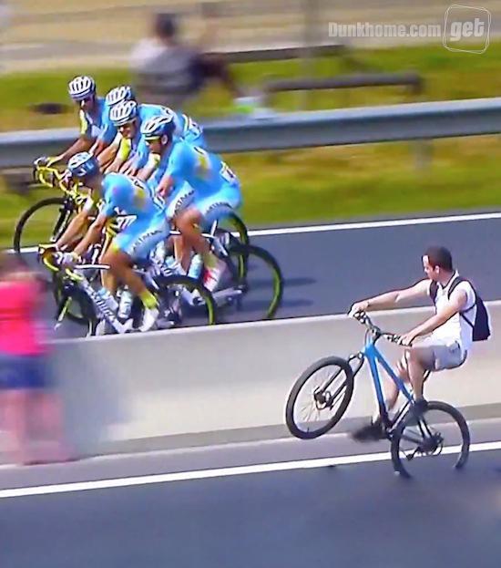 Vincenzo Nibali 是2014年环法冠军,但一位没戴头盔的家伙骑着一辆燕把、齿胎的碟刹山地车在Vincenzo Nibali身边抬起前轮,仅用后轮跟骑了很长一段时间,赛后观众对这个家伙关注度远高于赛事本身。