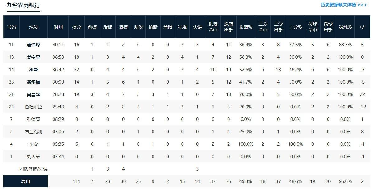九台农商银行马利克-纽曼32分4板6助,吴昌泽19分7板3助1帽,姜宇星18分4板4助;