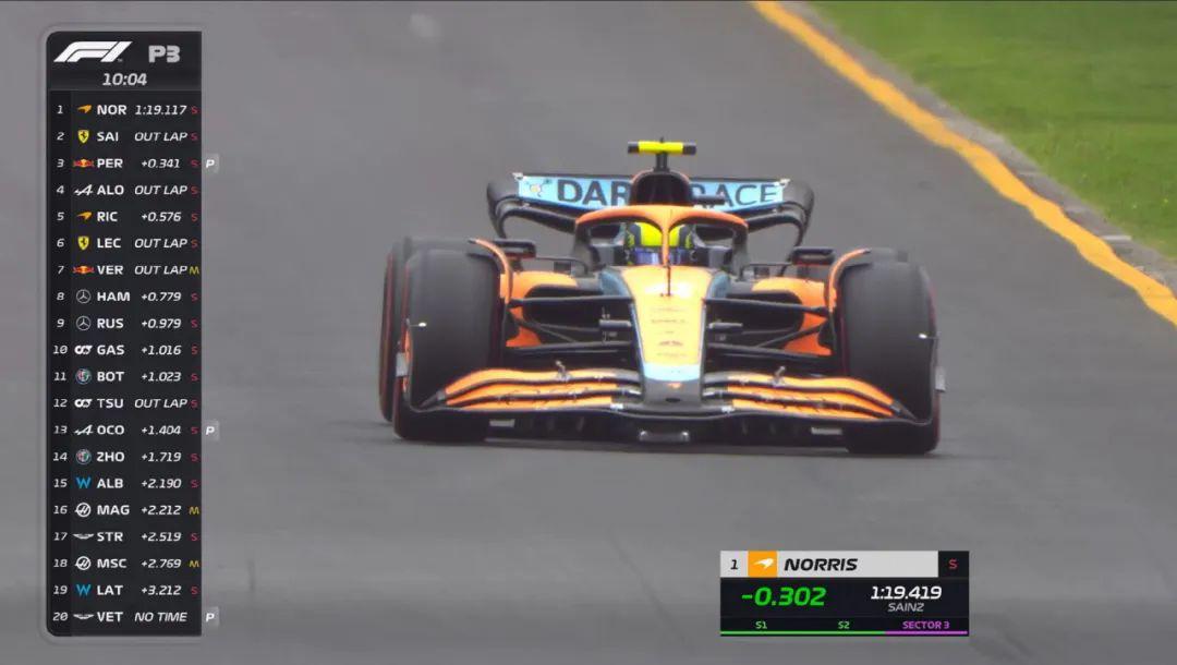 比赛剩余10分钟,诺里斯做出1:19.117的成绩,排名全场第一。