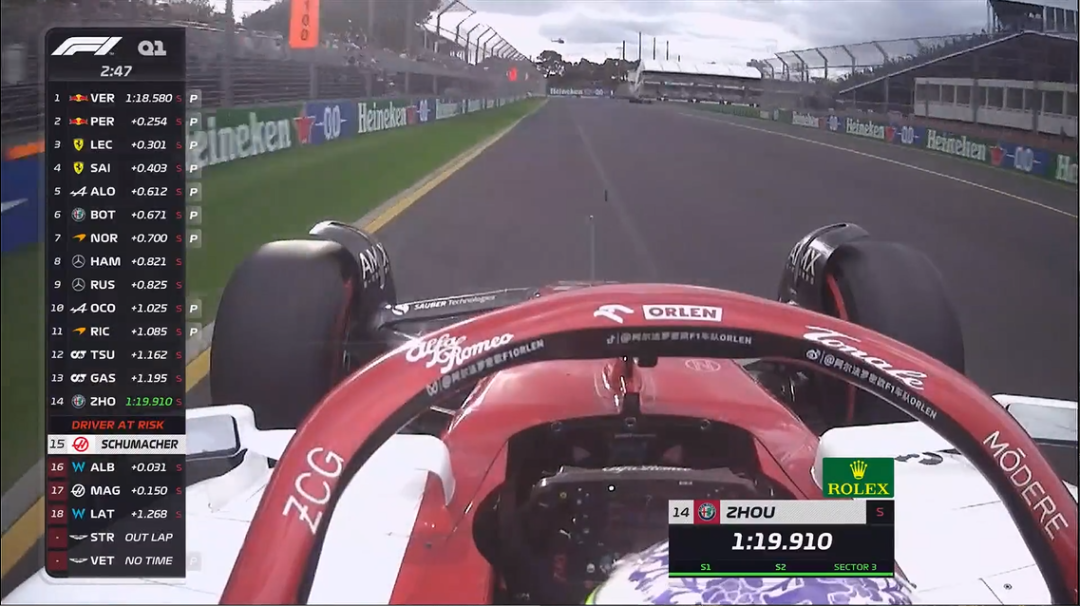 Q1剩余2分钟,周冠宇将自己的成绩提升至第14。此时米克·舒马赫、阿尔本、马格努森、拉提菲和维特尔位于淘汰区。