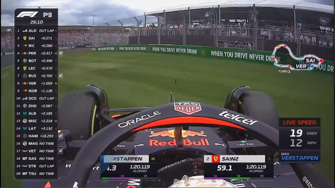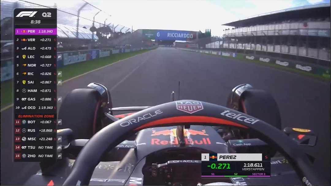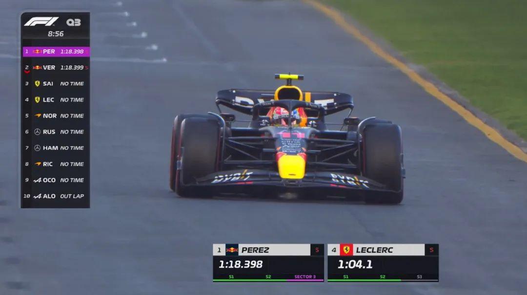 Q3起表后,维斯塔潘率先做出成绩,但佩雷兹随后以0.001秒的优势领先于队友。
