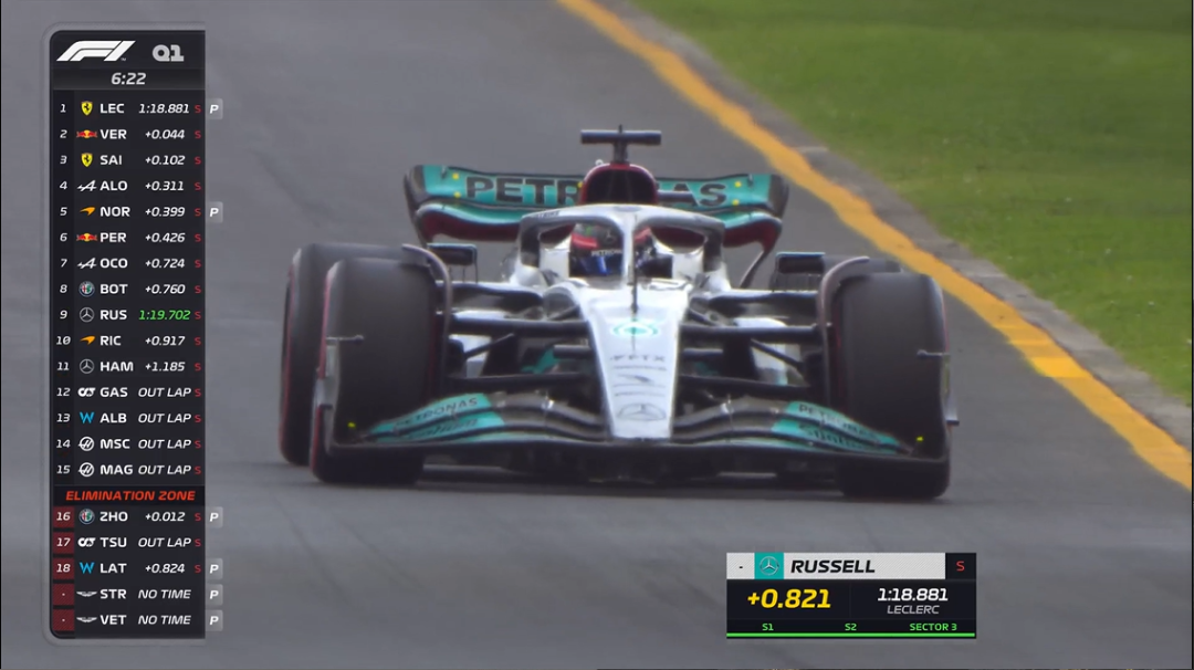 拉塞尔和汉密尔顿的第一个计时圈分别排名第9和第11,汉密尔顿出现了小失误。