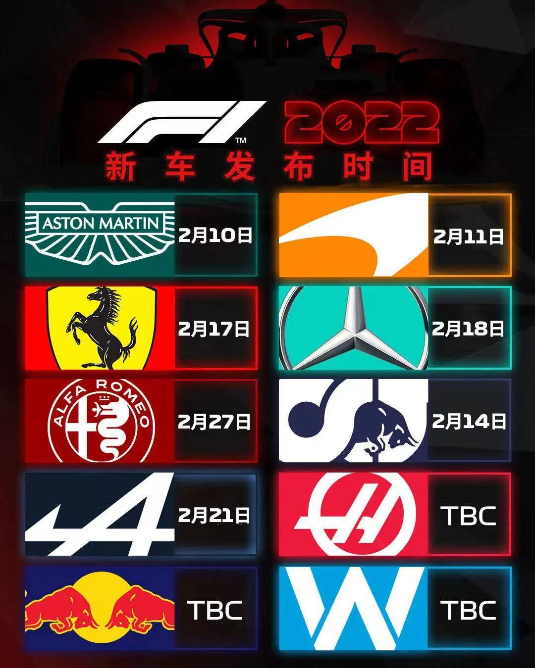阿斯顿·马丁车队:2月10日迈凯伦车队:2月11日红牛二队:2月14日法拉利车队:2月17日梅赛德斯车队:2月18日Alpine车队:2月21日阿尔法·罗密欧车队:2月27日