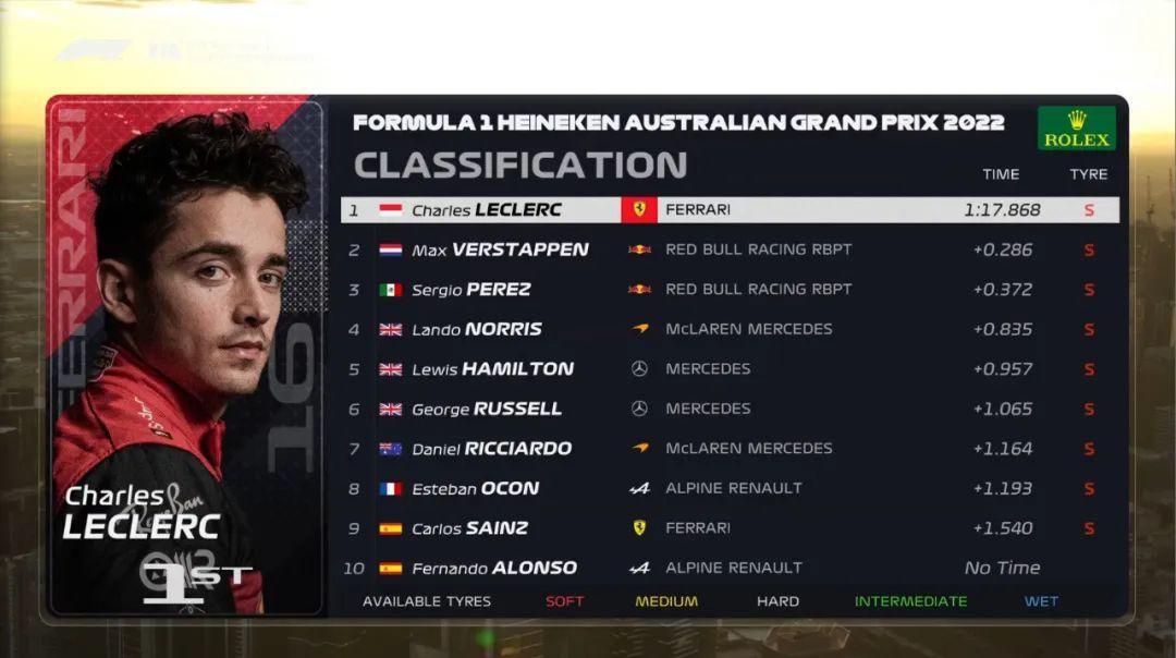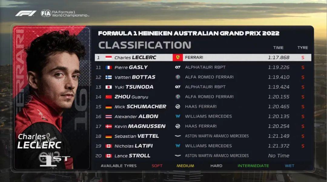 北京时间4月9日下午,F1澳大利亚大奖赛周六排位赛在墨尔本阿尔伯特公园赛道正式结束。勒克莱尔夺得杆位,这也是法拉利自2007年之后首次在澳大利亚墨尔本赢得杆位,维斯塔潘第二,佩雷兹第三。