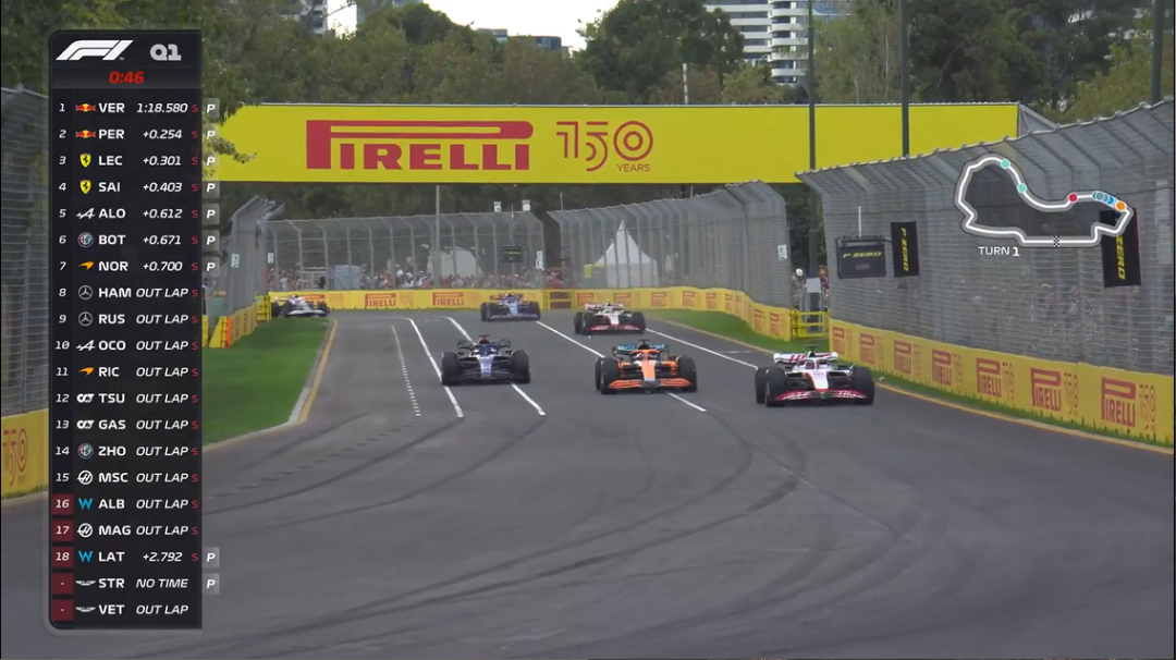 距Q1停表仅剩下最后1分钟,所有车手都在争取尽早开始自己的计时圈,赛道交通状况有些拥挤。
