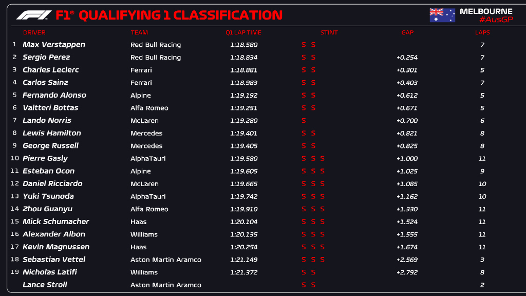 第一轮飞驰圈过后,维斯塔潘暂列第一;阿隆索第二;佩雷兹第三;勒克莱尔第四;两位迈凯伦车手分列五六。