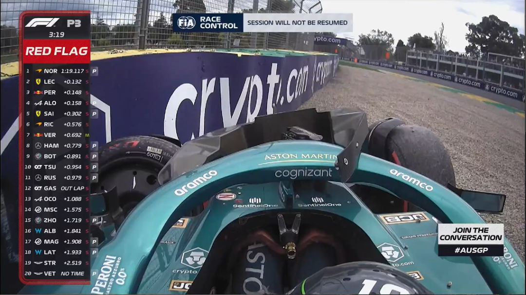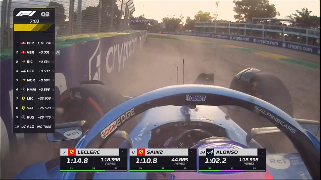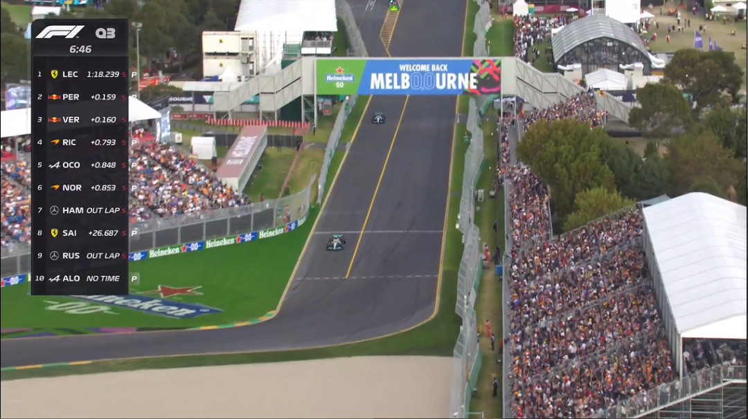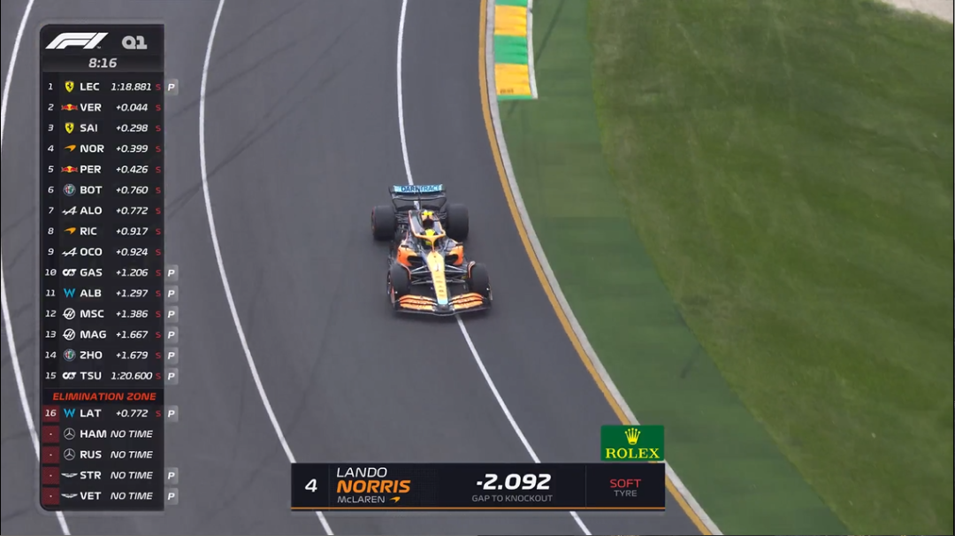 Q1剩余8分钟,两台梅赛德斯及阿斯顿·马丁赛车均没未做出有效成绩。此前在三练中,两位阿斯顿·马丁车手都发生了撞车事故。
