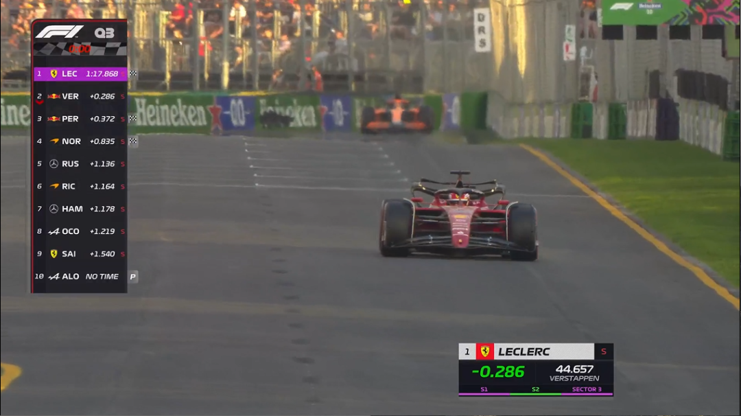 最后一轮计时圈,维斯塔潘先是刷新成绩上至第一,但随后勒克莱尔做出了更完美的一圈,获得了杆位!