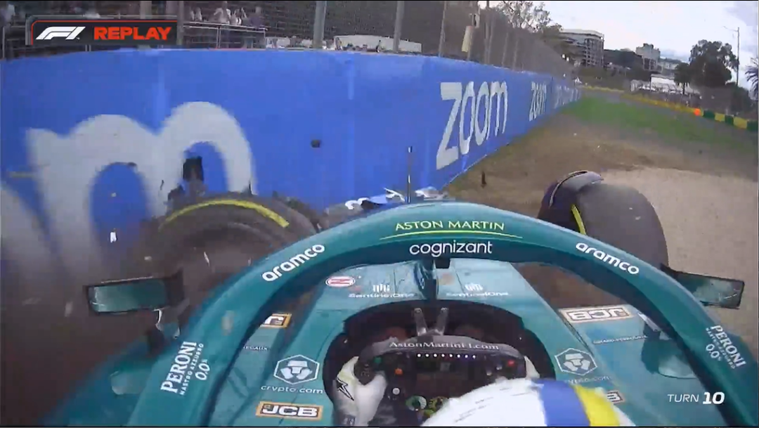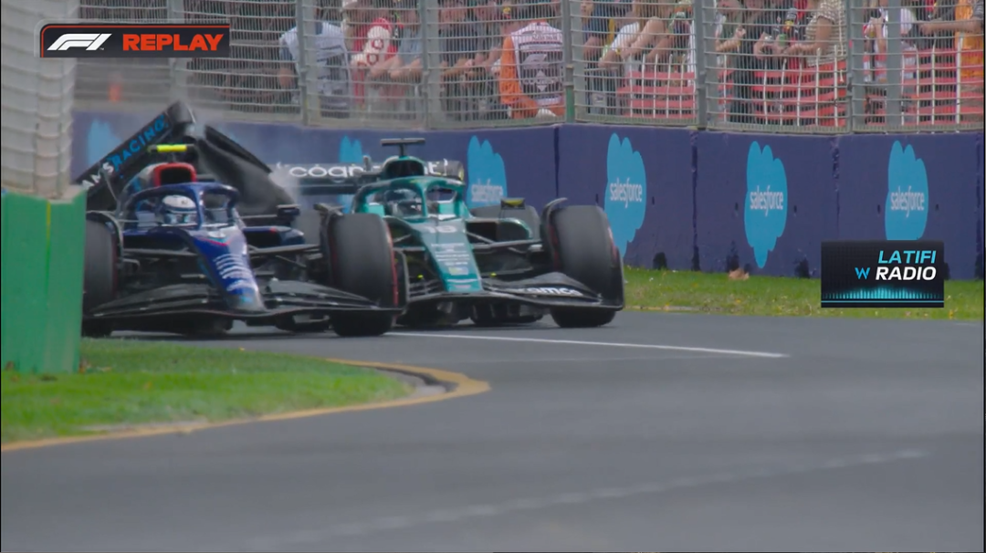红旗!拉提菲与斯托尔两车相撞。拉提菲的赛车损毁严重,退出了比赛。斯托尔的右前悬挂受损,也停在了路边。赛会将会对此事故进行调查。