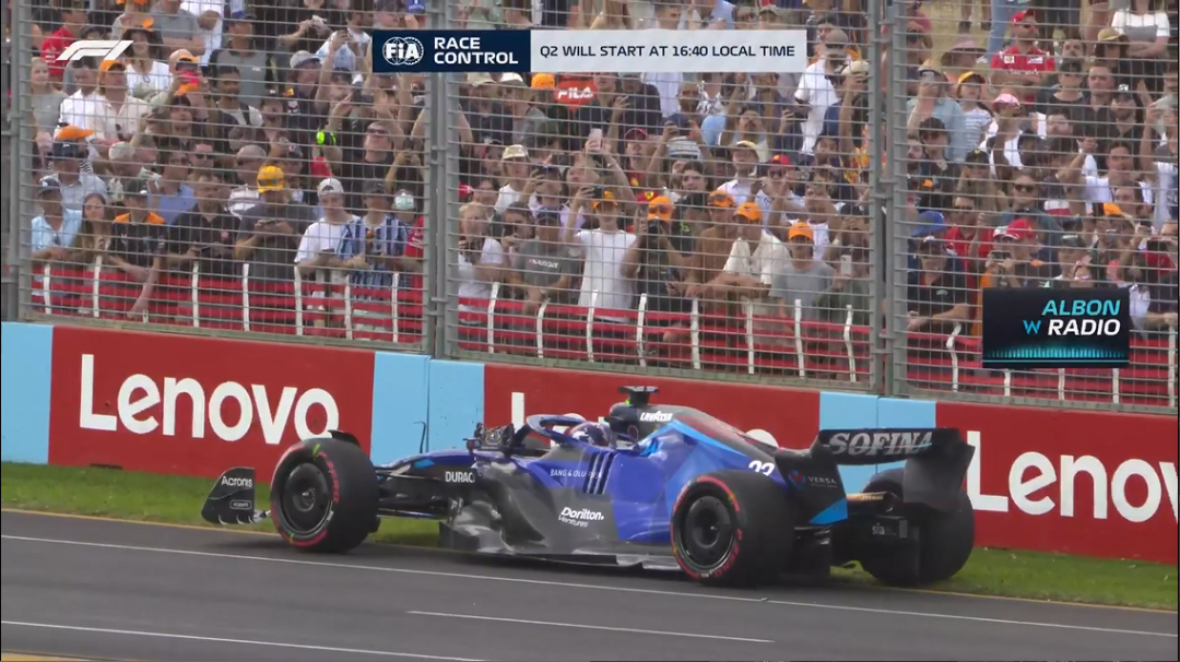 阿尔本的赛车出现故障,停在了赛道路边,Q2推迟。