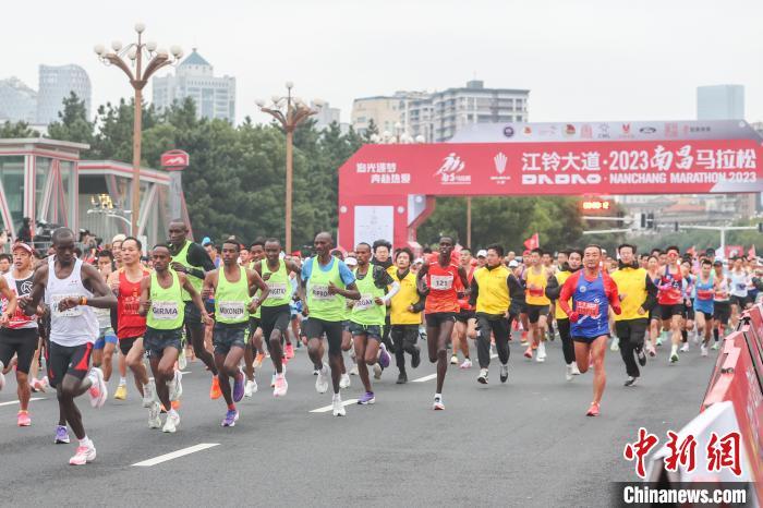 图为2023南昌马拉松鸣枪开跑,选手冲出起点开始比赛。 刘力鑫 摄