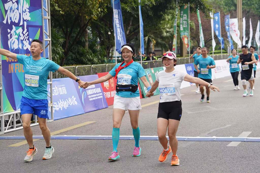 半程马拉松选手们在平坦的滨江赛道上竞速奔跑,不断挑战自己的极限。