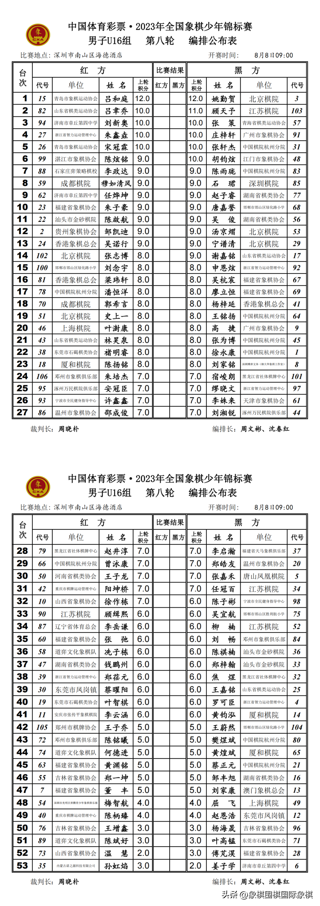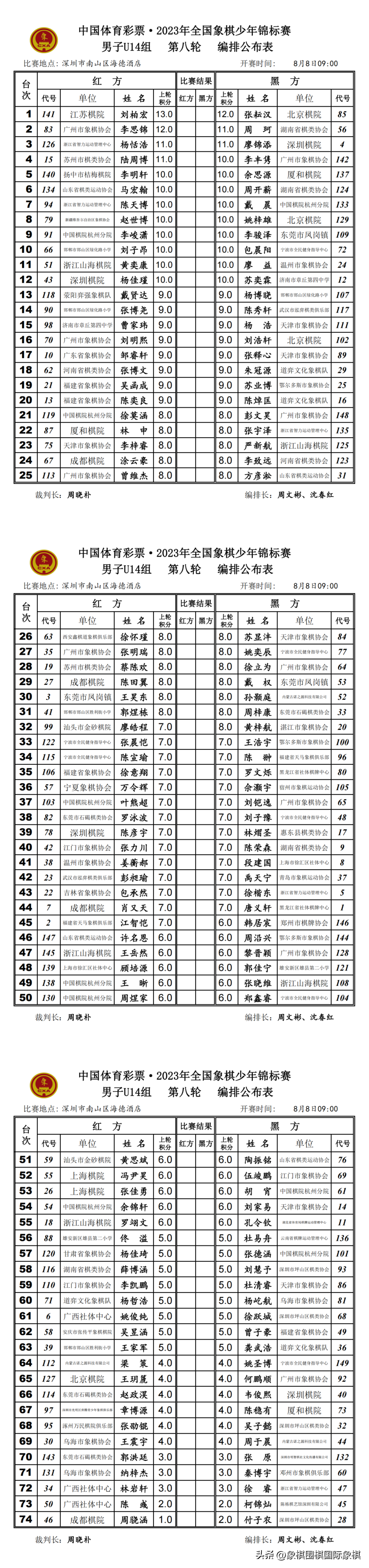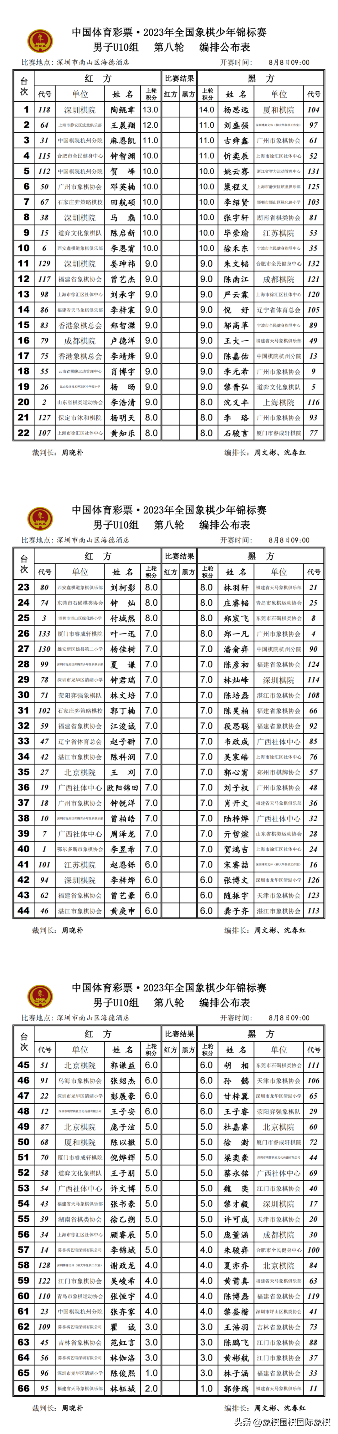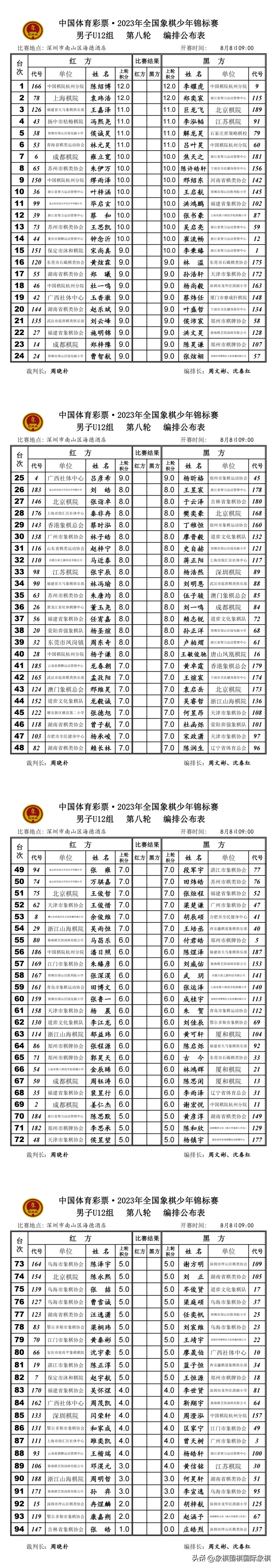 2023年少年锦标赛|男子U10-16组第八轮、女子U10-16组第七轮编排结果