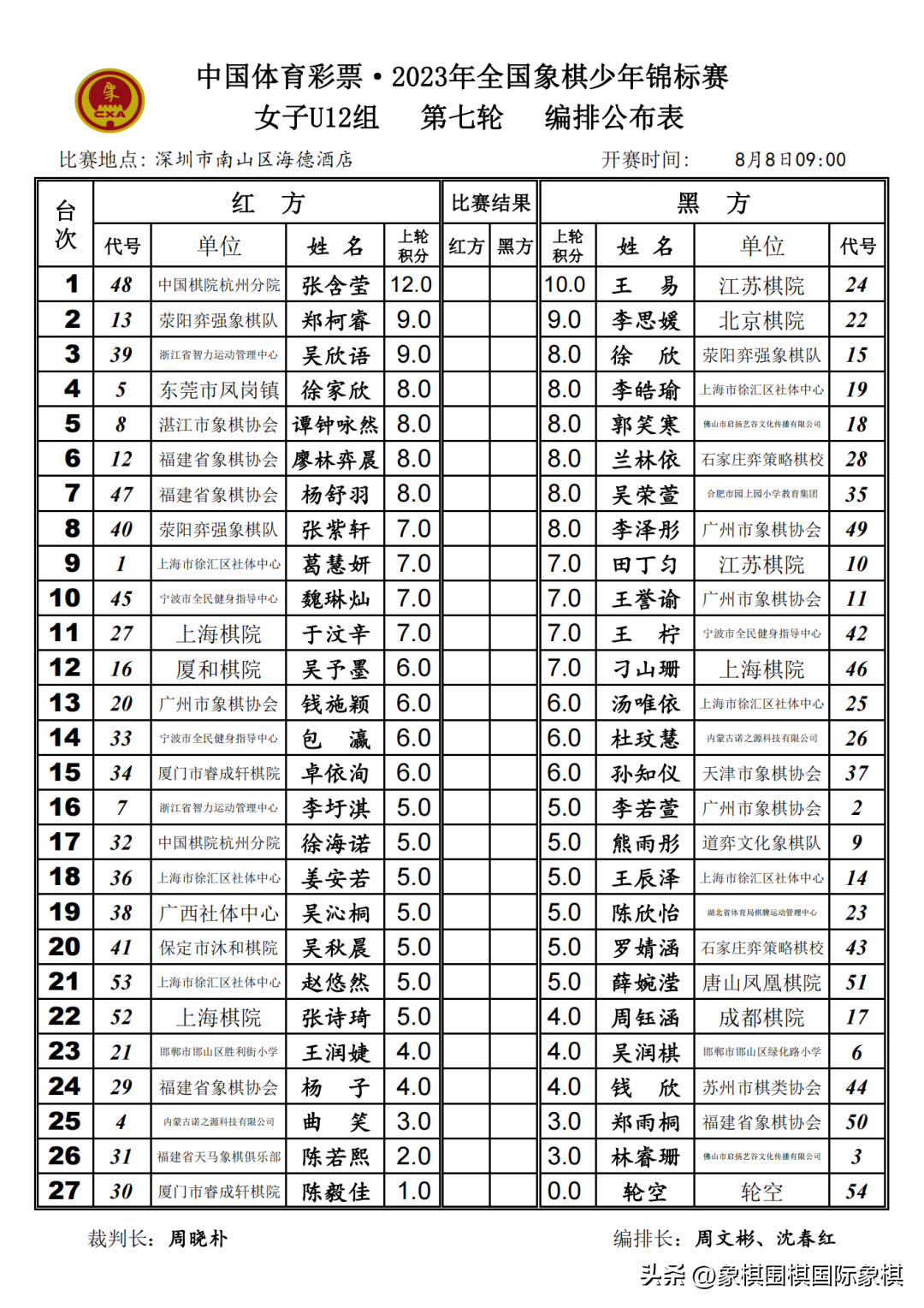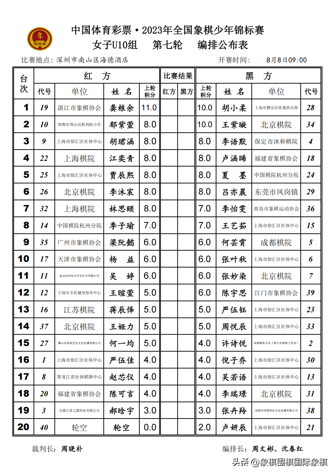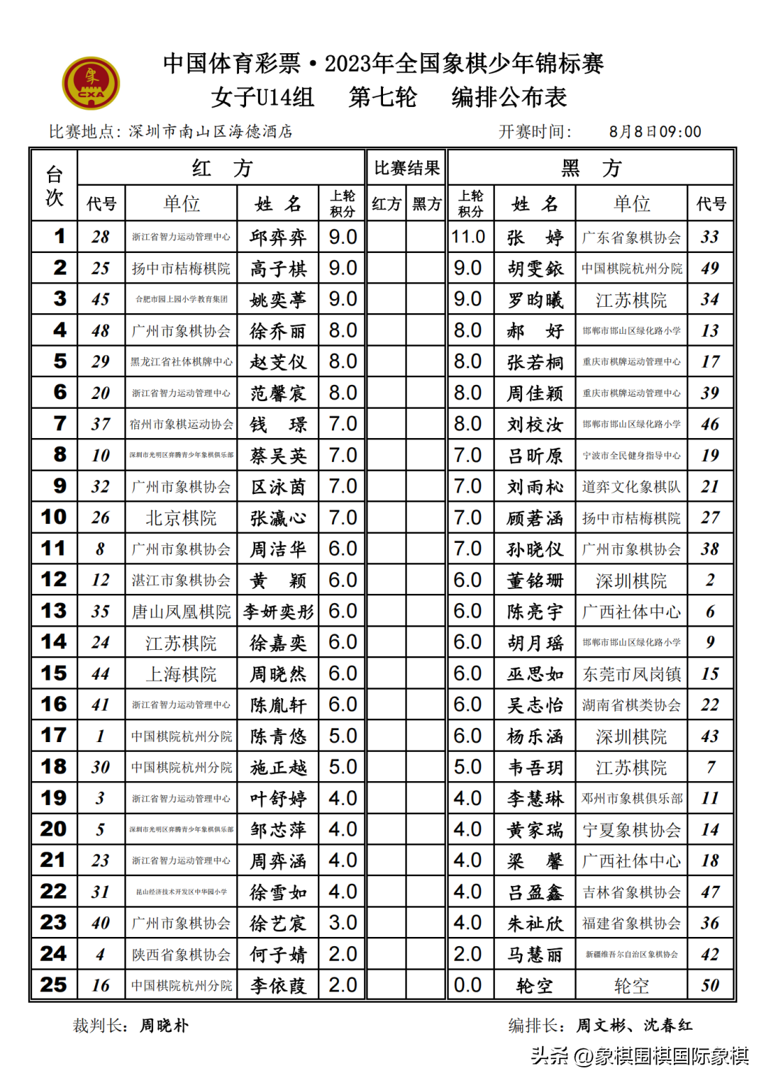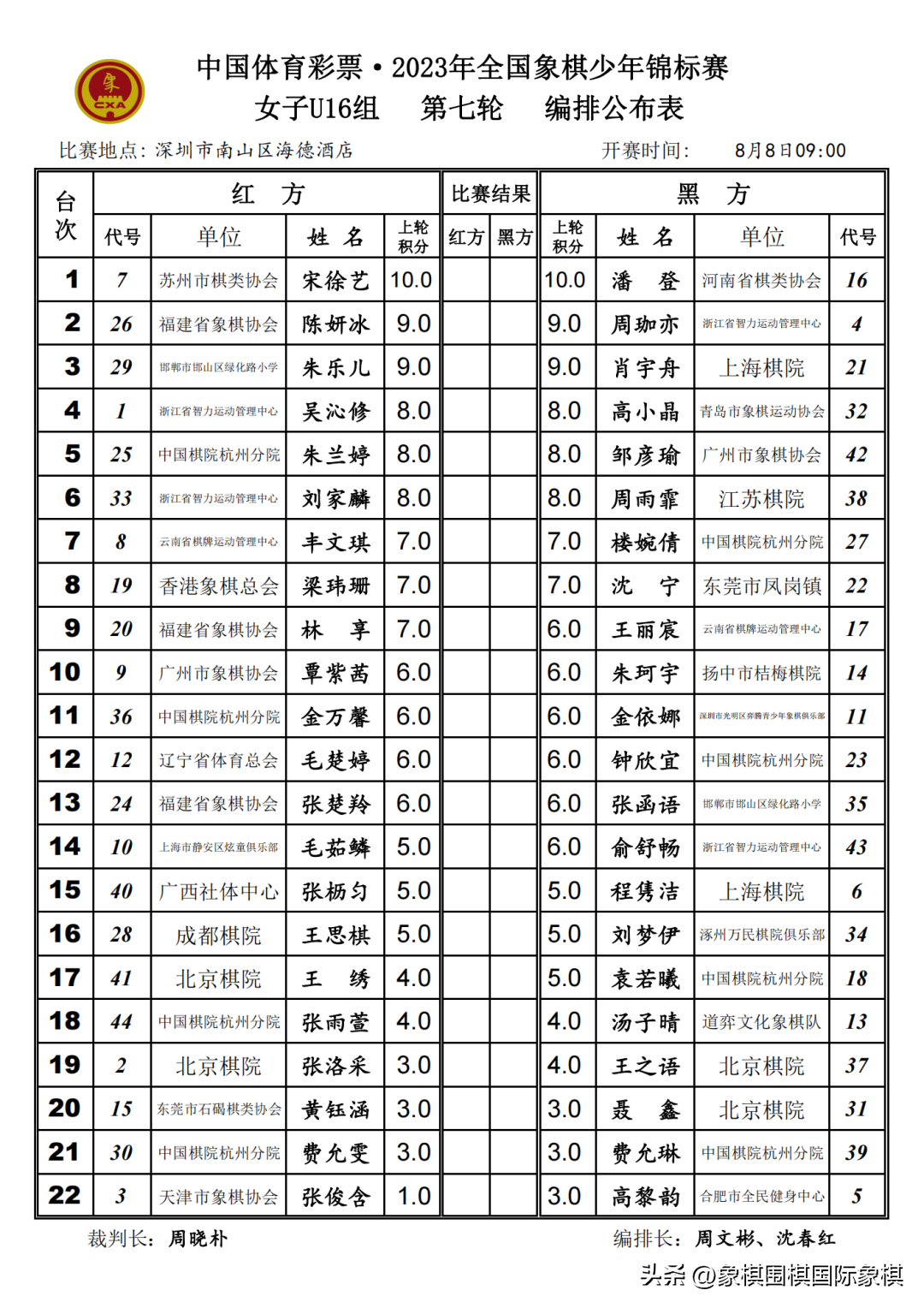 2023年少年锦标赛|男子U10-16组第八轮、女子U10-16组第七轮编排结果
