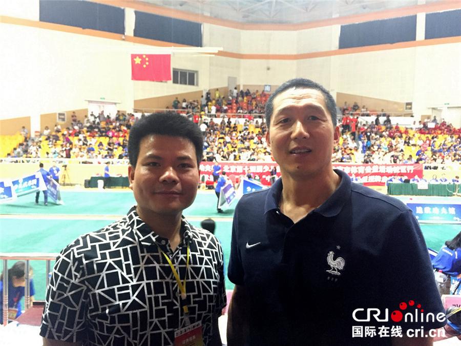北京少儿武术研究会副会长兼大赛组委会副主任阙志华与新中国成立后第一个“中华武状元”、北体大教授陈超大赛现场合影
