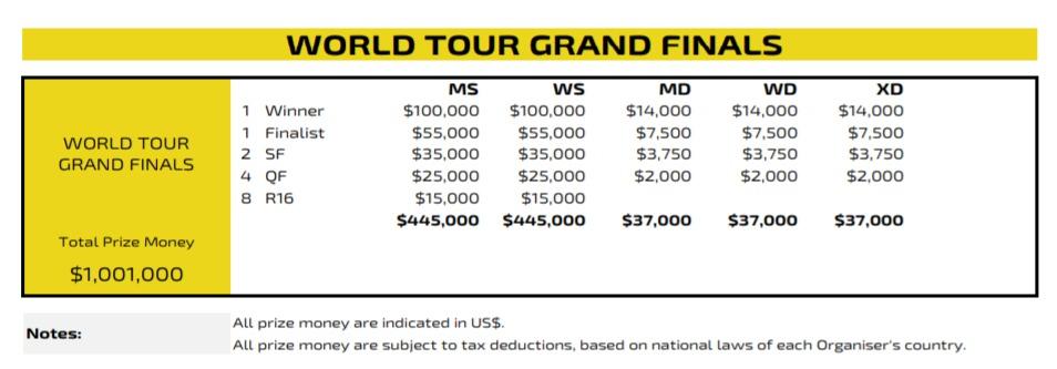 本次比赛的奖金分配方案也已公布。比赛总奖金为100万零1000美元,所有参赛选手都有保底奖金,单打选手为1.5万美元,双打组合为2000美元。男女单打冠军将各获得10万美元,双打冠军则只有1.4万美元。单打亚军的奖金为5.5万美元,进入四强有3.5万美元,打进第二轮可以拿到2.5万美元。双打亚军奖金为7500美元,四强组合再减半为3750美元。