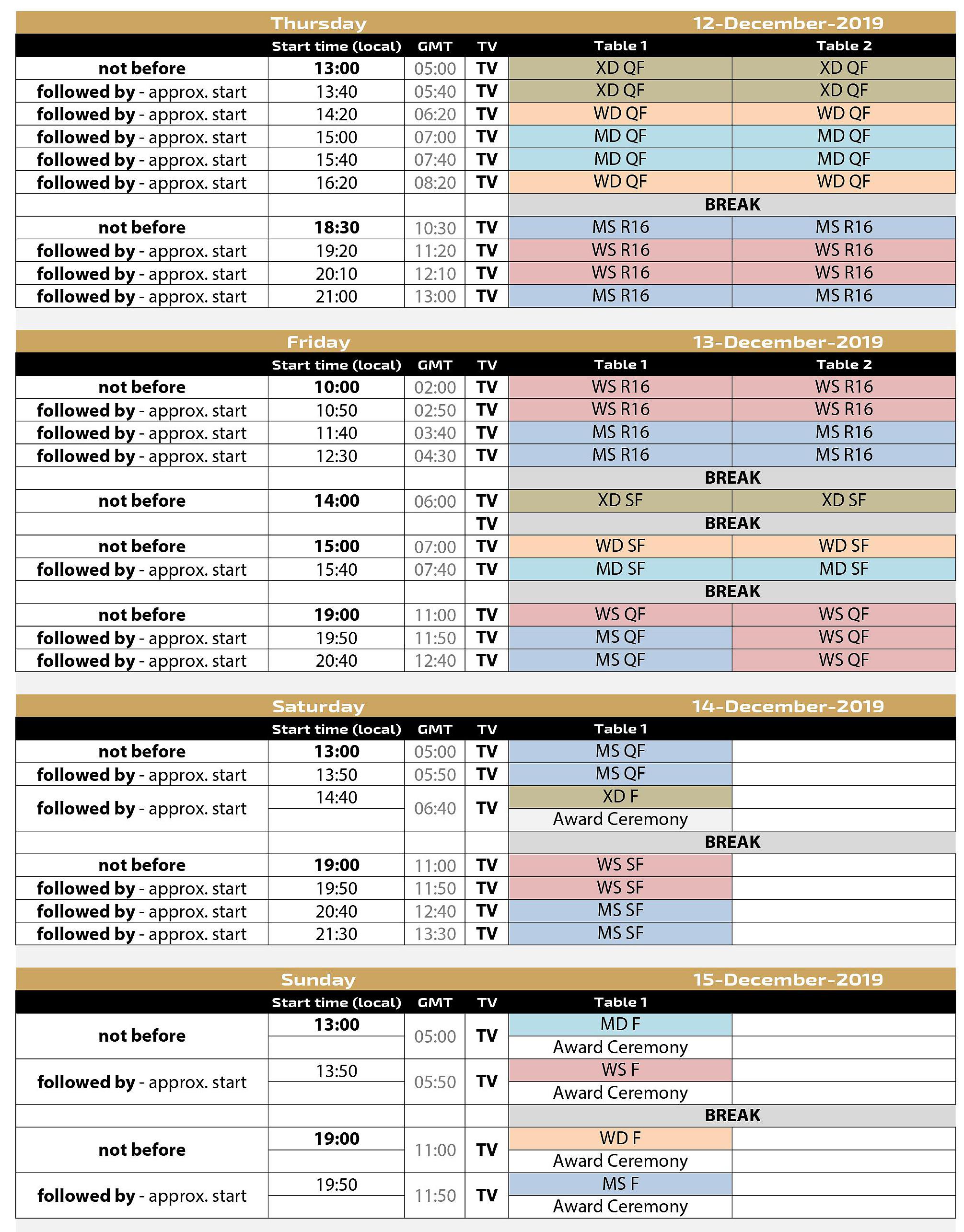 比赛将于北京时间12月12日13时打响,首日进行双打1/4决赛和男女单打各4场首轮比赛。12月14日14:40将进行混双决赛,产生首个年终总冠军。本次比赛的混双前四名还将获得东京奥运会入场券。12月15日依次进行男双、女单、女双和男单决赛。