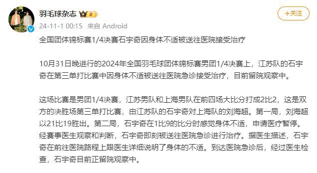 据中国羽毛球协会官方杂志@羽毛球杂志 11月1日凌晨消息,石宇奇在第三单打比赛中因身体不适被送往医院急诊接受治疗,目前留院观察中。
