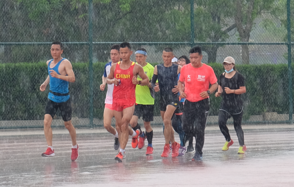 10点左右五六级的大风把场边的帐篷都差点吹翻了;11点天气逐渐阴了起来,远处听见了打雷的声音。11点20左右,风雨交加,大雨点噼里啪啦下了下来,而杨涛和陪跑的跑友们仍在坚持,杨涛的配速在4分55左右徘徊。