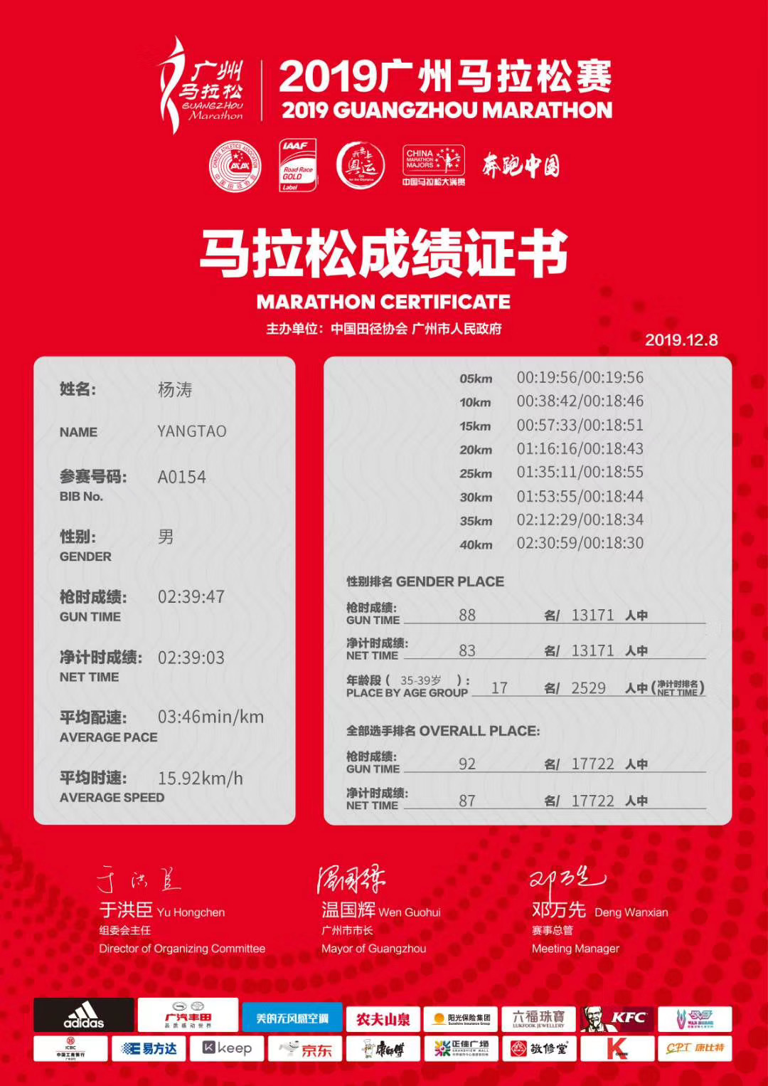 第一场全程马拉松,3小时40分左右完赛,杨涛现在还记得最后10公里跑得很痛苦,咬着牙坚持了下来。