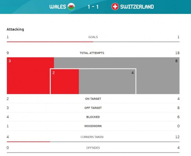 随后的时间,双方都没有再进球,最终瑞士队1-1和威尔士队战平,两队各拿一分。