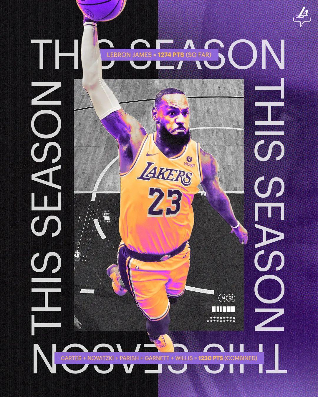 正如湖人队发布的海报中所述:截至北京时间2月29日的洛杉矶德比前,詹姆斯本赛季得分达到1274分,而其他球员在生涯第21个赛季的得分总和不过1230分。