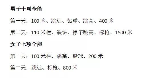 全能运动是跑、跳、投掷等不同田径单项在规定日期内按一定顺序进行的综合性项目,包括男子十项全能和女子七项全能。具体分项如图: