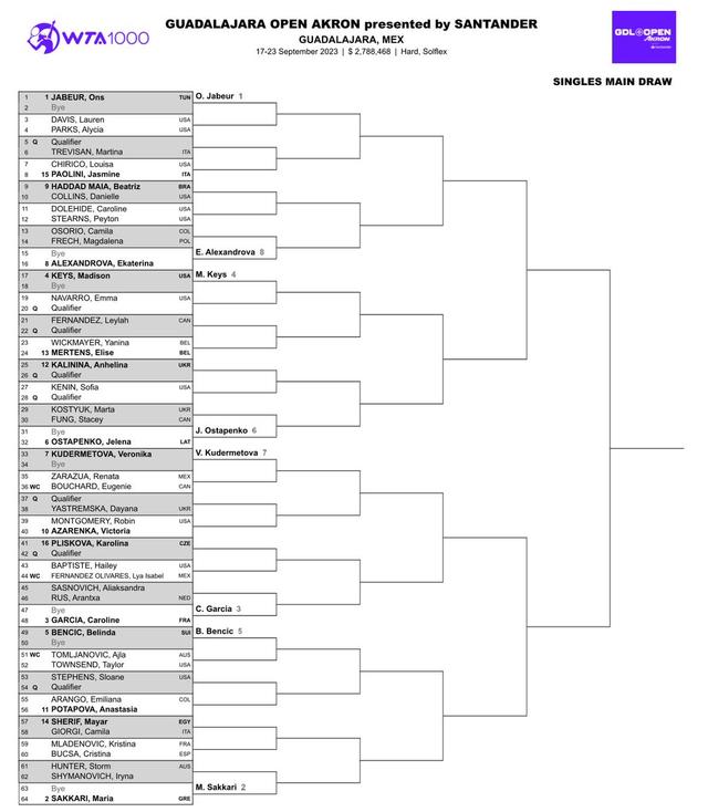 由于各大球星的缺席,今年的第二届瓜达拉哈拉公开赛,是签表最为开放的1000赛之一。贾巴尔、萨卡里和加西亚今年的状态一直不佳,年末有巨分要保。与此同时,萨巴伦卡、斯瓦泰克、莱巴金娜、高芙和卫冕冠军佩古拉等状态良好的球星的缺席,让这站大赛变得更加开放。