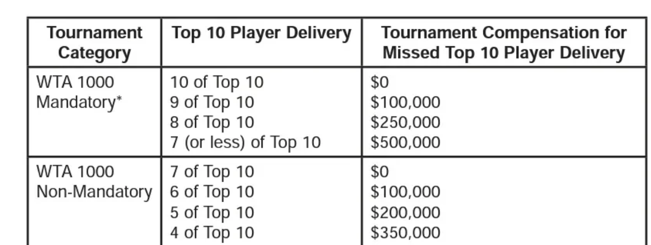 该规则规定,非强制性的1000赛事,如果有四位世界前十球员参加,WTA需向该项1000赛补贴350000美元;如果只有五位世界前十球员参加,需要补贴200000美元;如果只有六位世界前十球员参加,补贴额度为100000美元;只有前十球员参赛人数达到7位及7位以上,WTA才不用贴补。