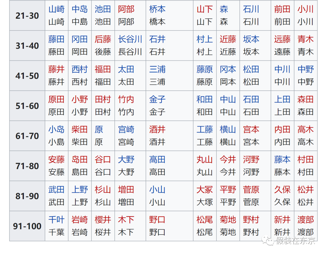 由于日本人的姓氏真的太多了,维基百科上就收录了几千个,这里附上排名前100的姓氏排行榜。注意,以下内容需要一些日语最基础的50音图,还不会50音图的朋友可以翻我以前文章:五十音图快速联想记忆法。