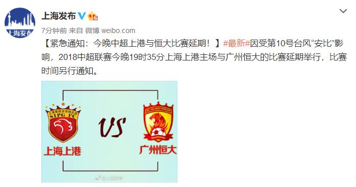 【紧急通知:今晚中超上港与恒大比赛延期!】#最新#因受第10号台风“安比”影响,2018中超联赛今晚19时35分上海上港主场与广州恒大的比赛延期举行,比赛时间另行通知。