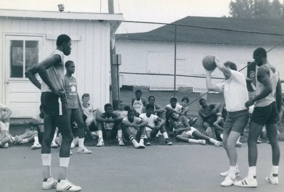 兰尼高中1978-79年年鉴当中的乔丹照片,右边穿着45号的乔丹在争抢篮板。