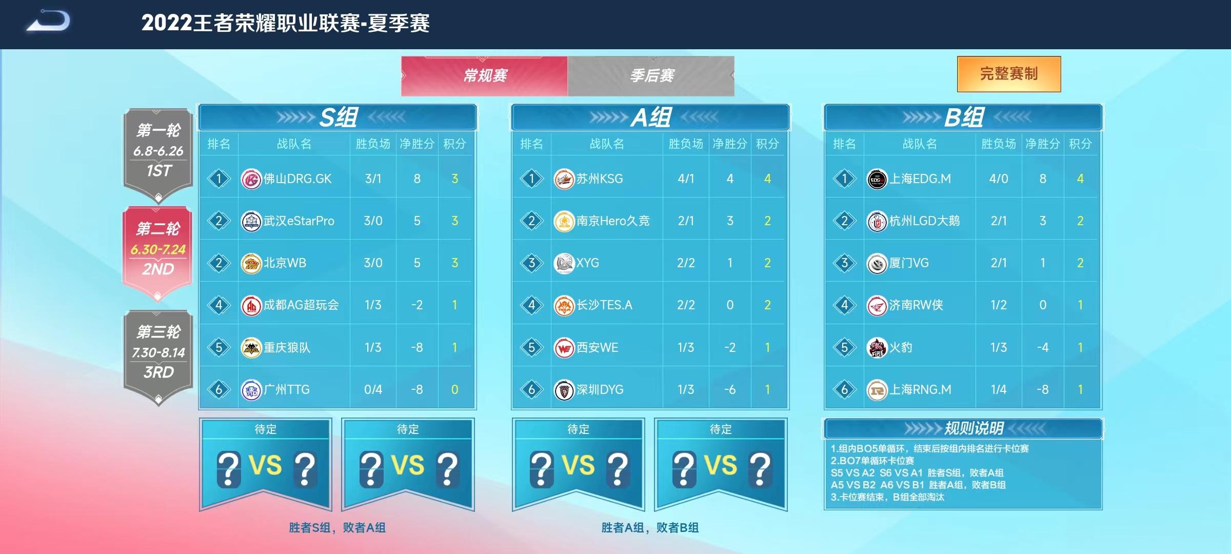佛山DRG.GK、武汉E星、北京WB、成都AG超玩会、重庆狼队、广州TTG。