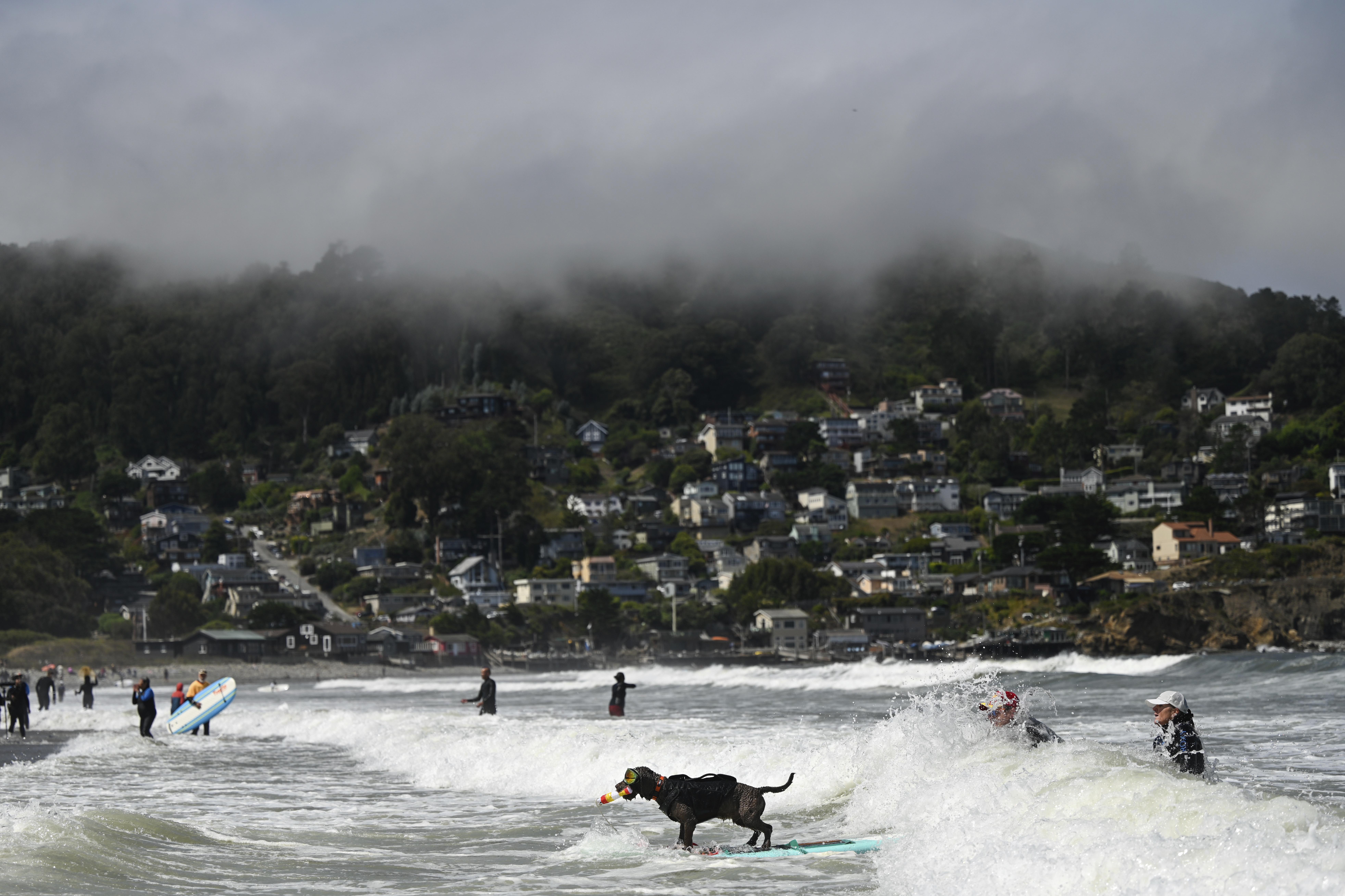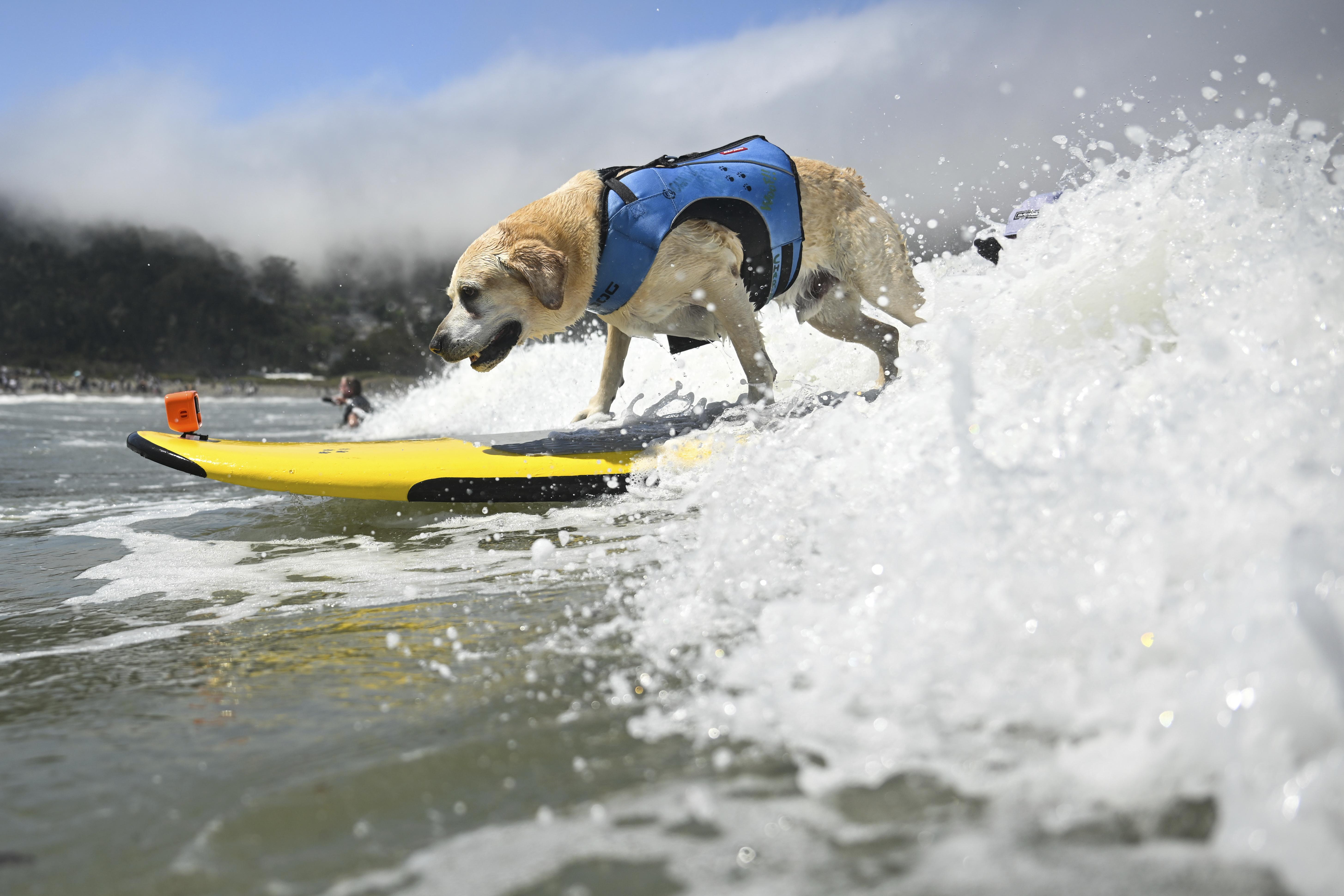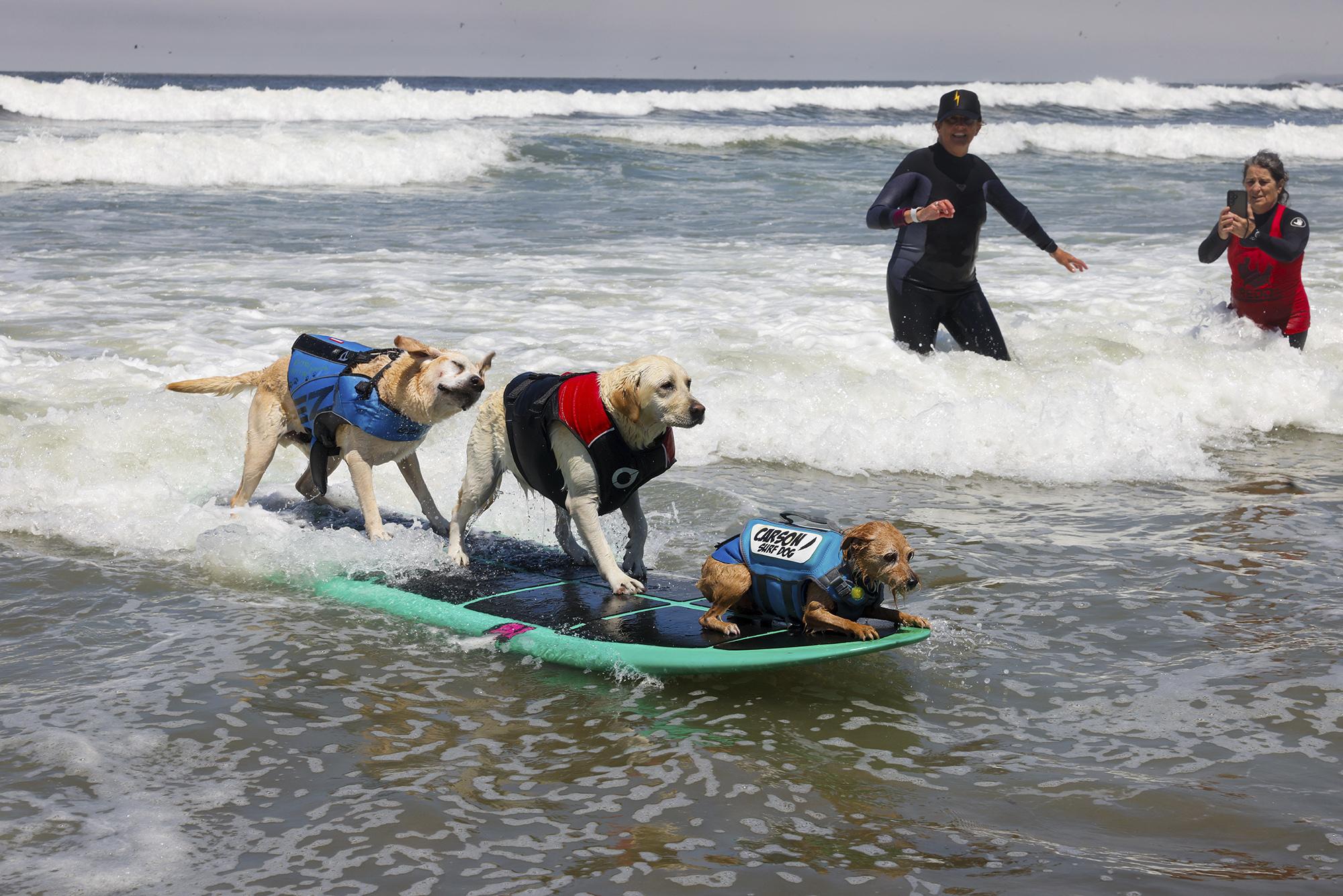 8月3日,在美国加利福尼亚州帕西菲卡,参赛犬参加狗狗冲浪比赛。 新华社/美联