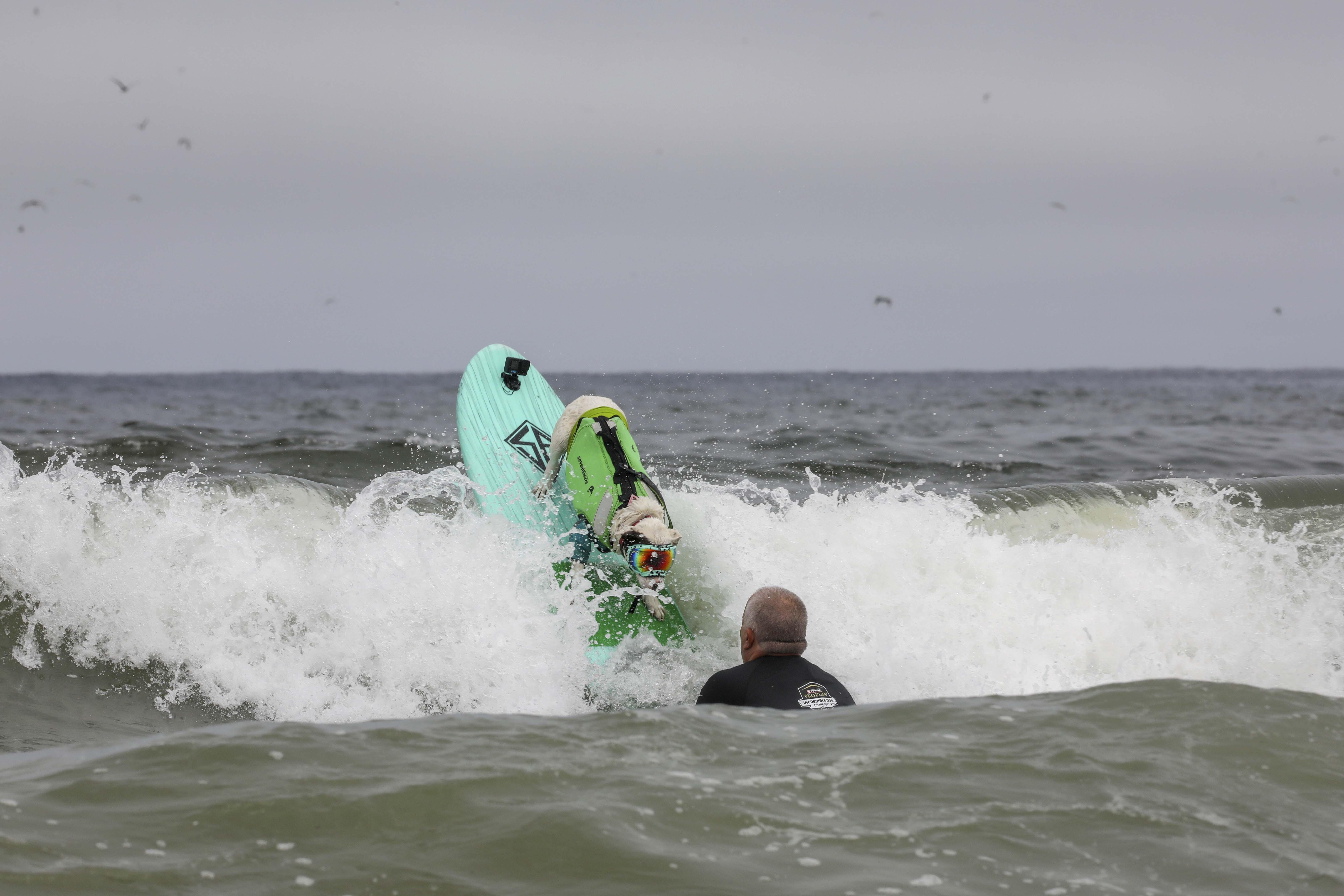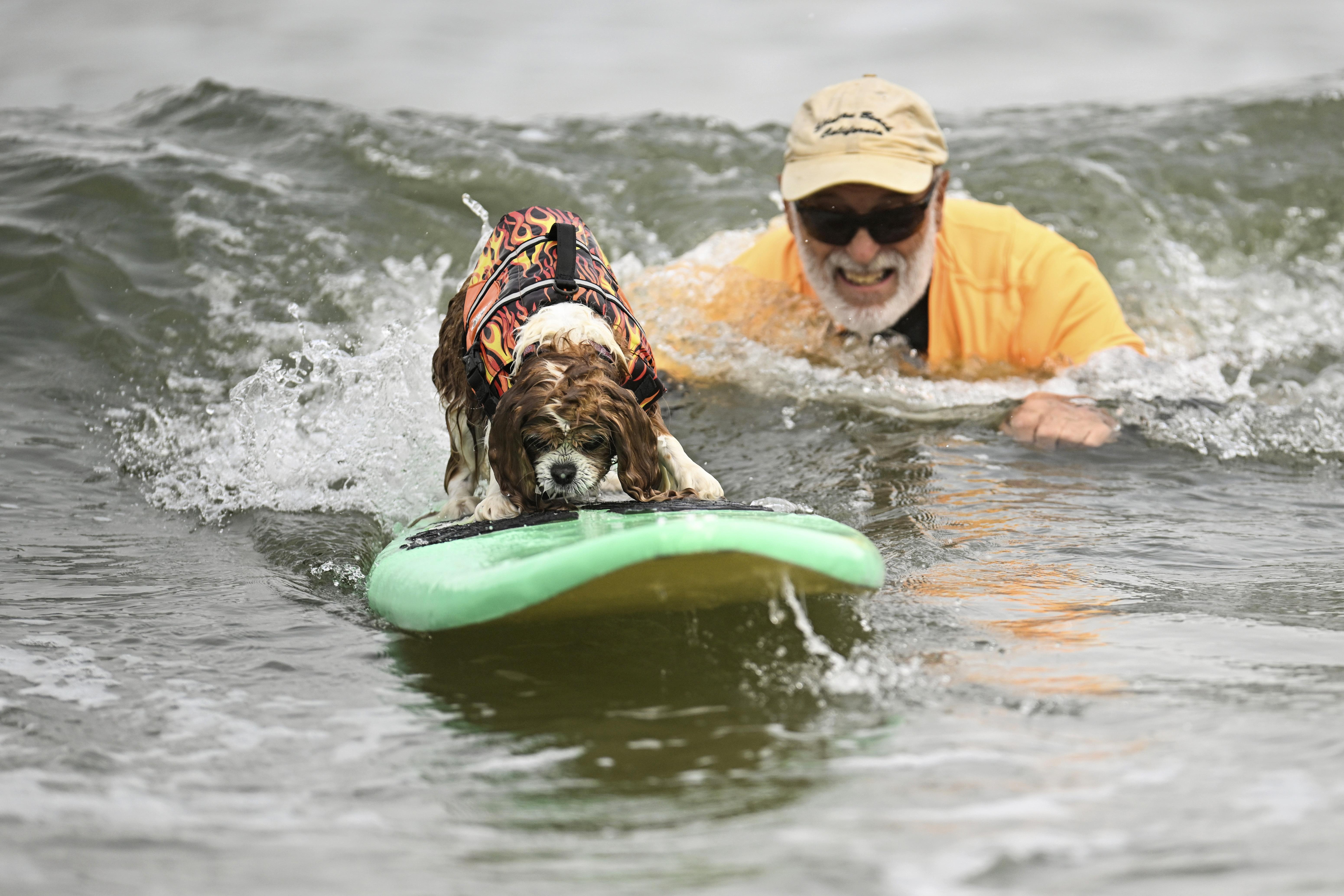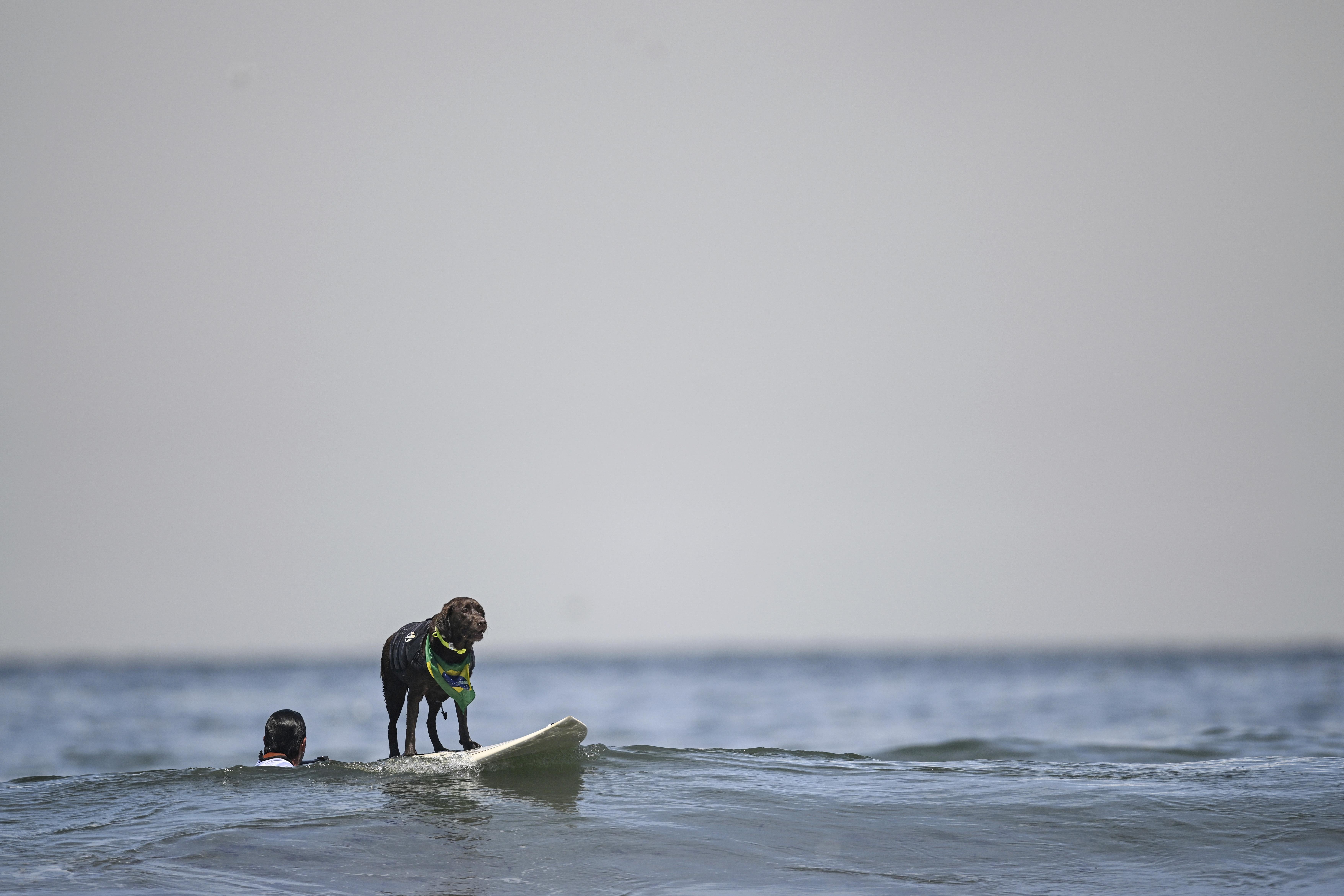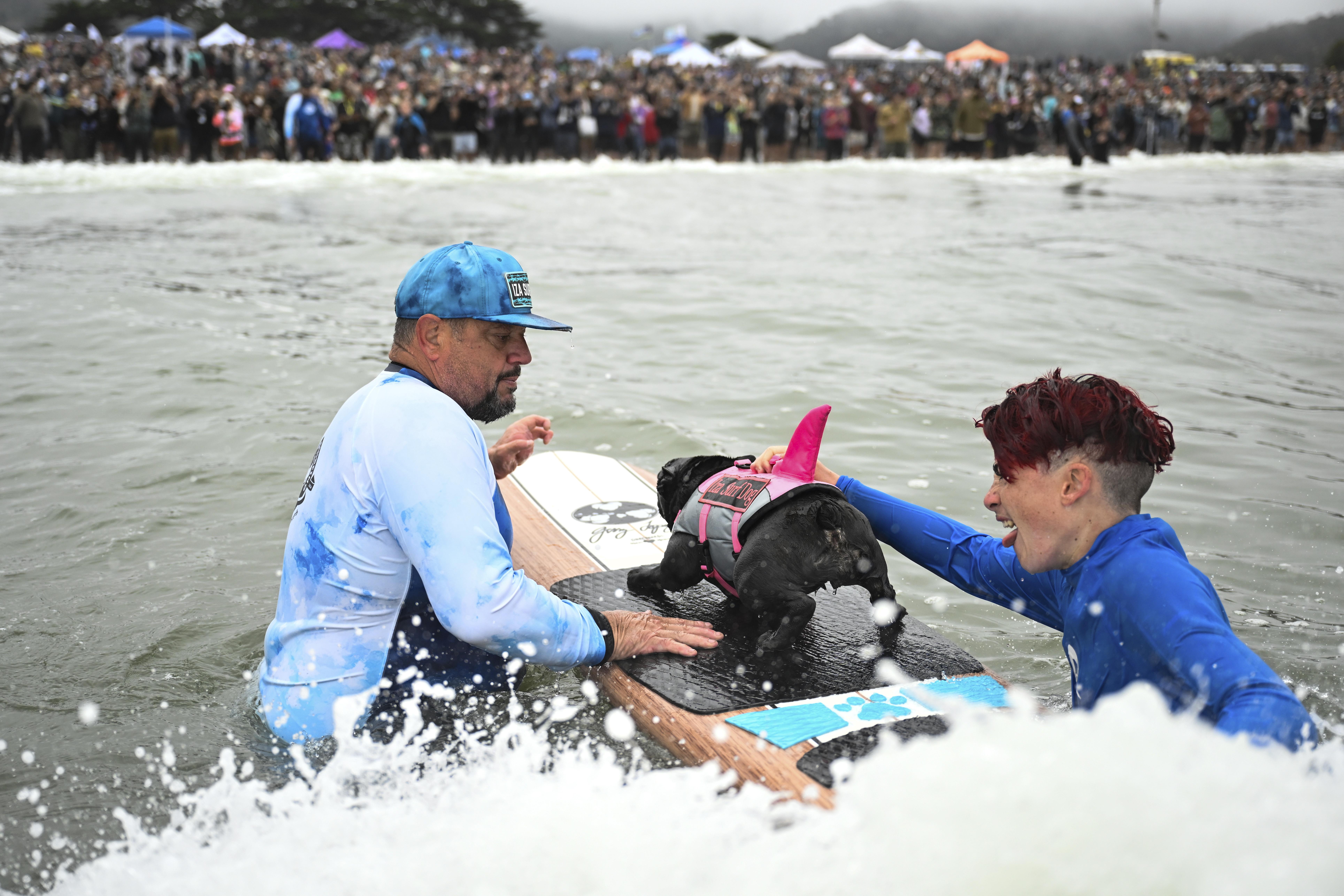 8月3日,在美国加利福尼亚州帕西菲卡,参赛犬参加狗狗冲浪比赛。 新华社/美联