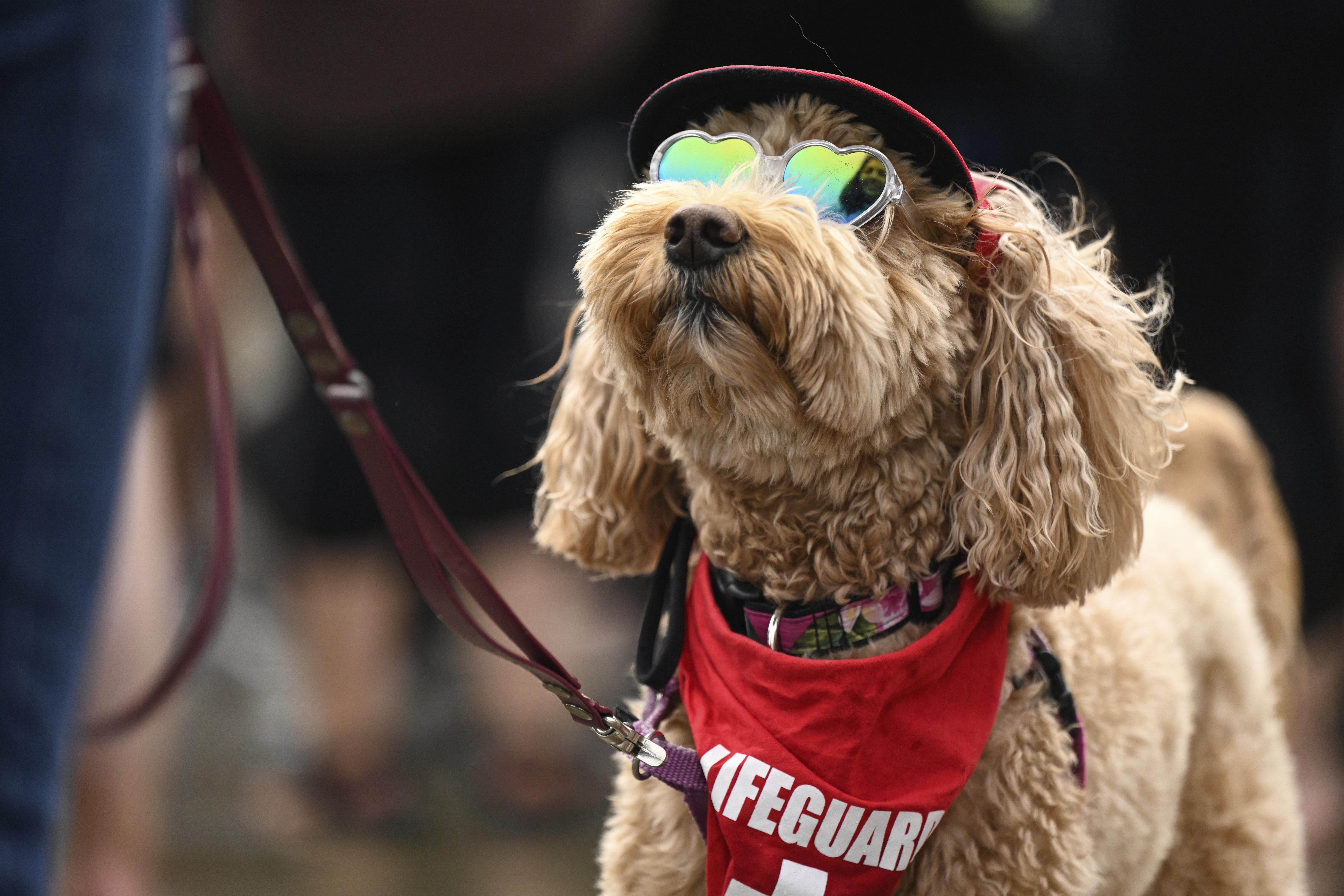 这是8月3日在美国加利福尼亚州帕西菲卡的沙滩上拍摄的一只宠物犬。 新华社/美联