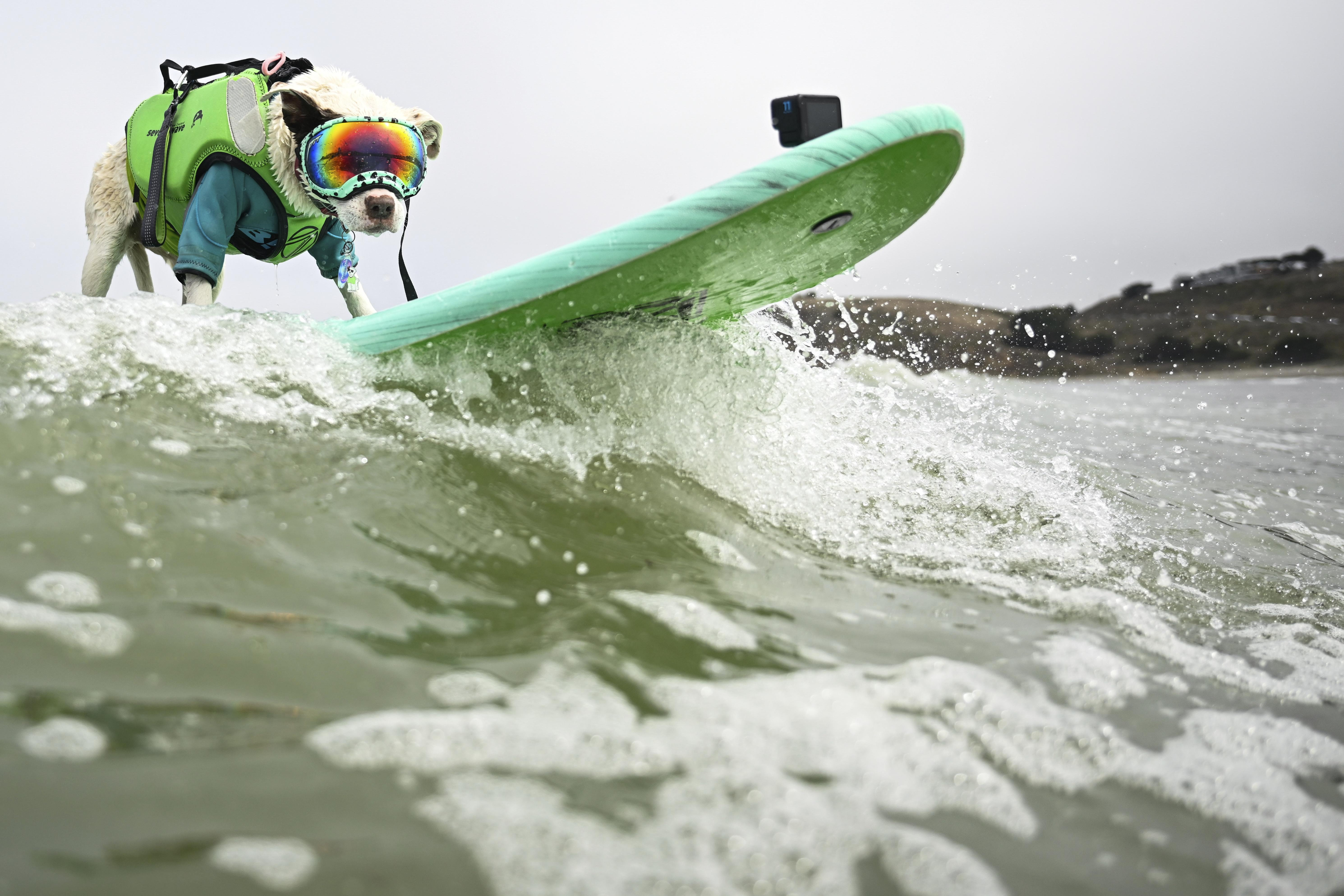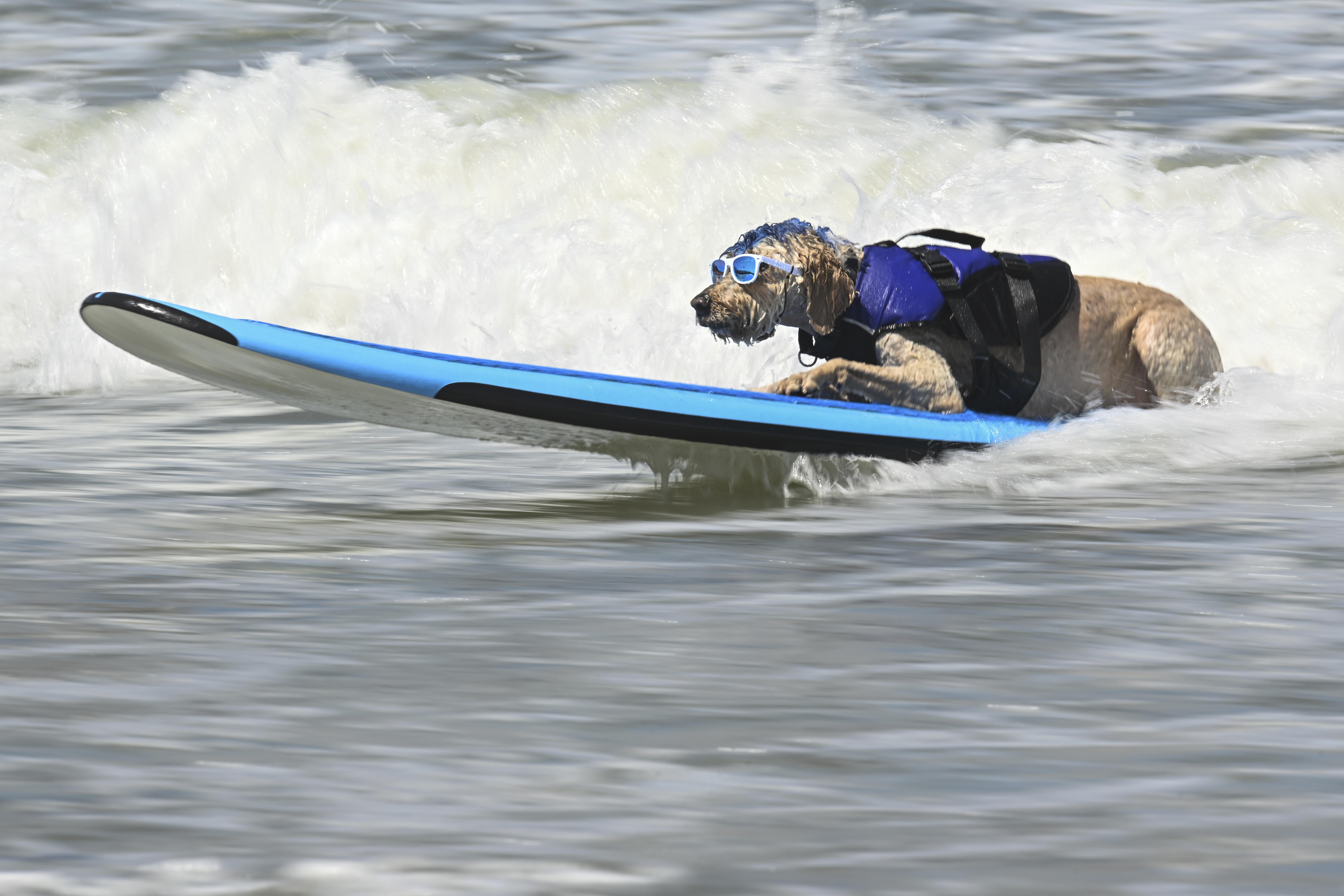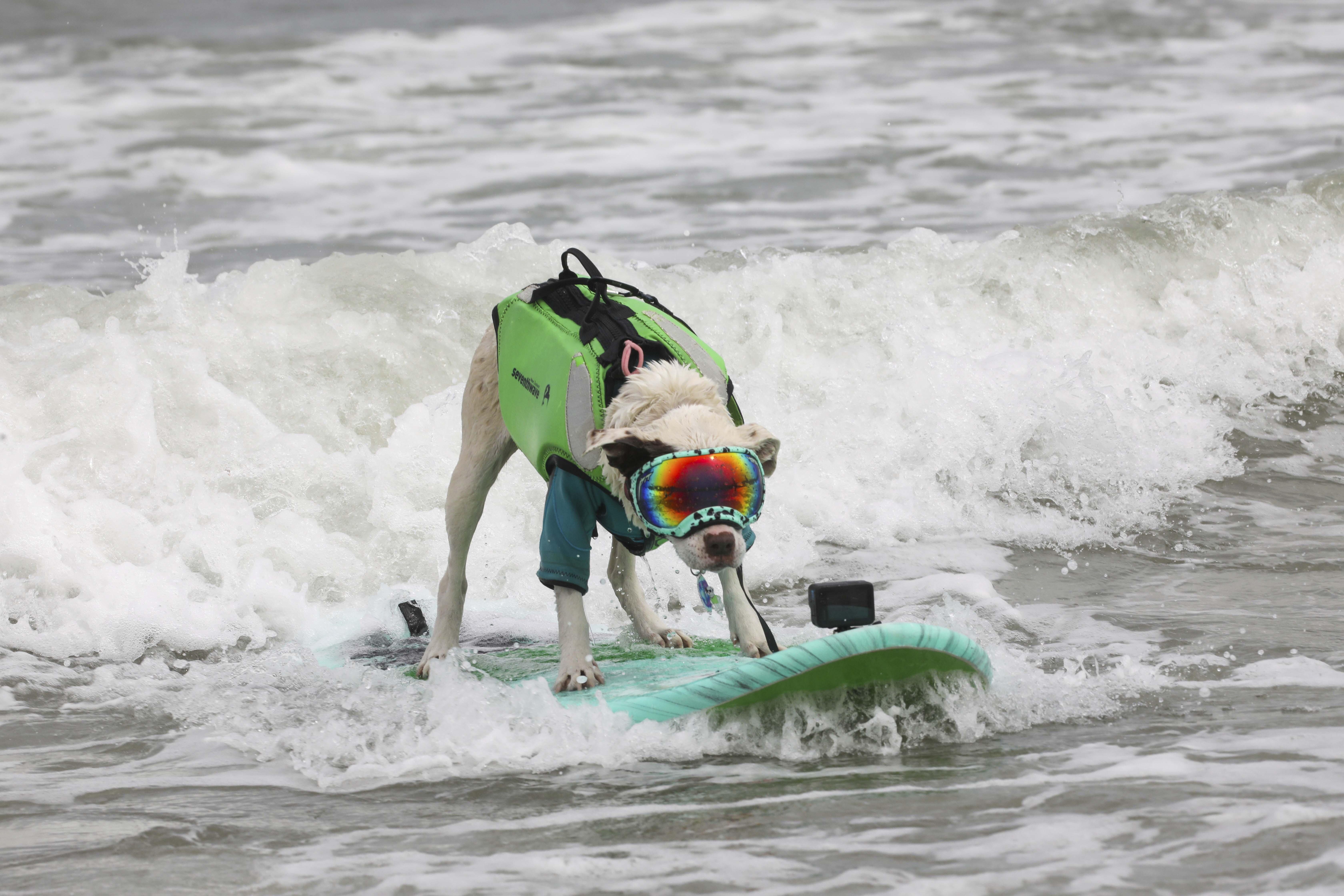 8月3日,在美国加利福尼亚州帕西菲卡,一只参赛犬参加狗狗冲浪比赛。 新华社/美联