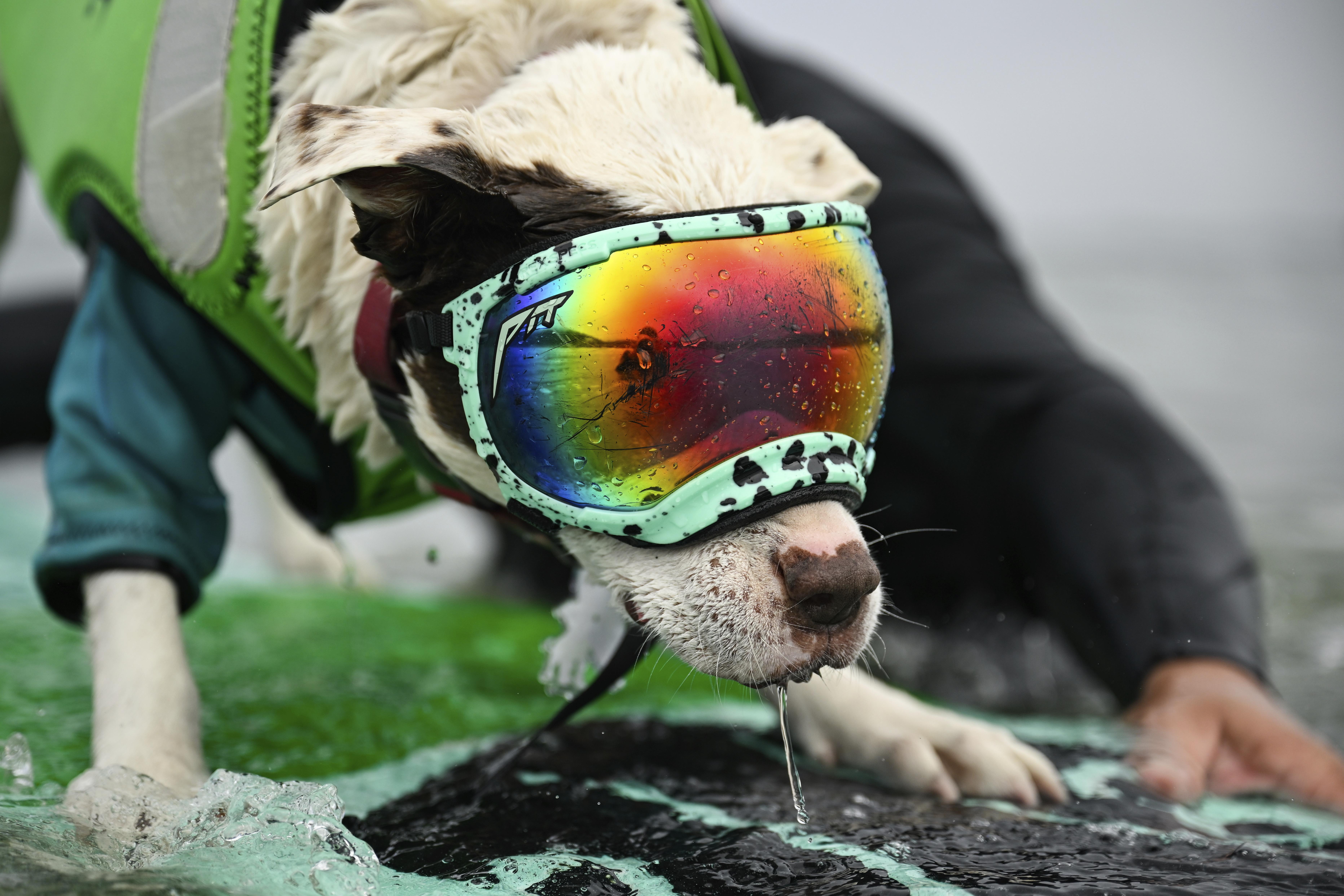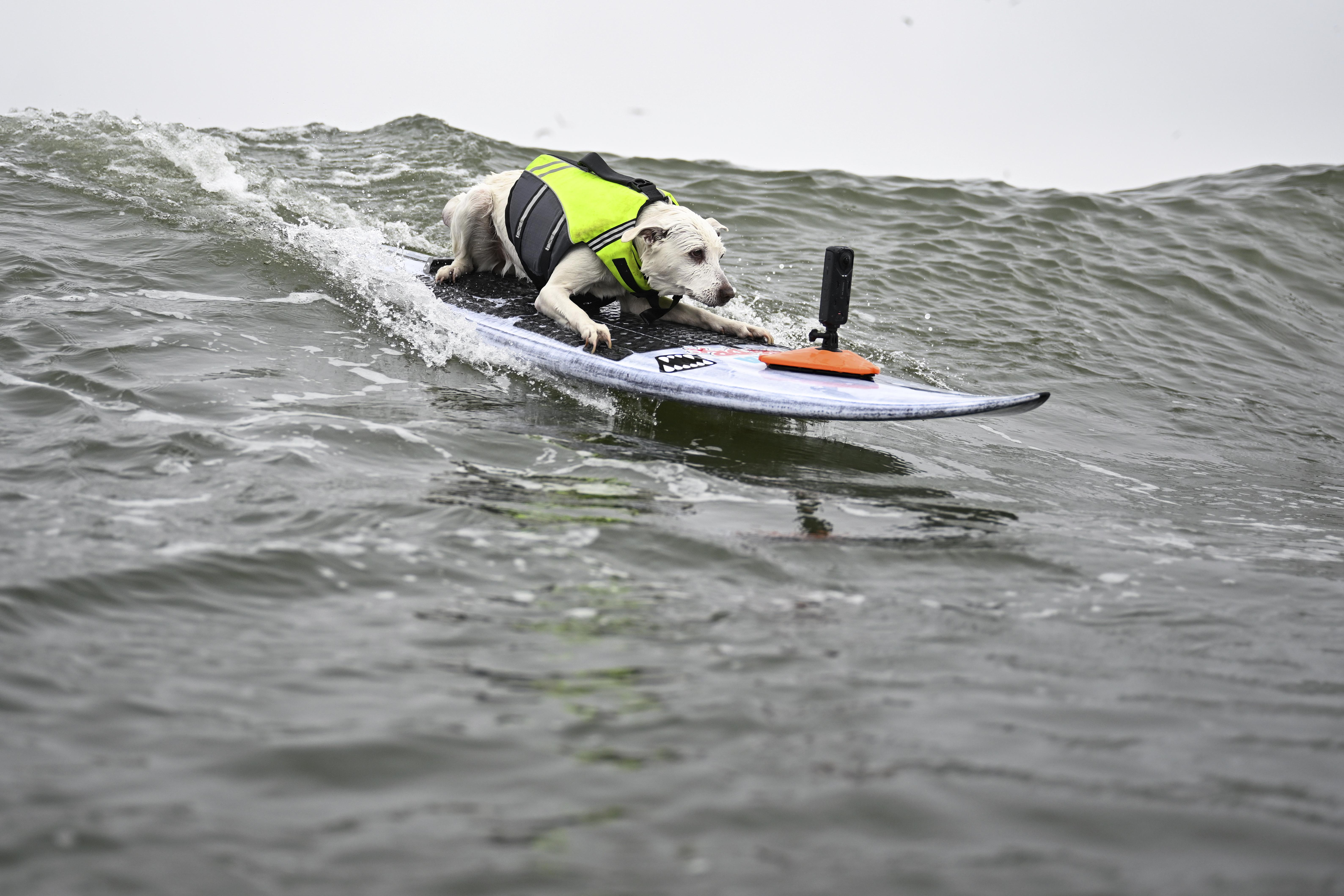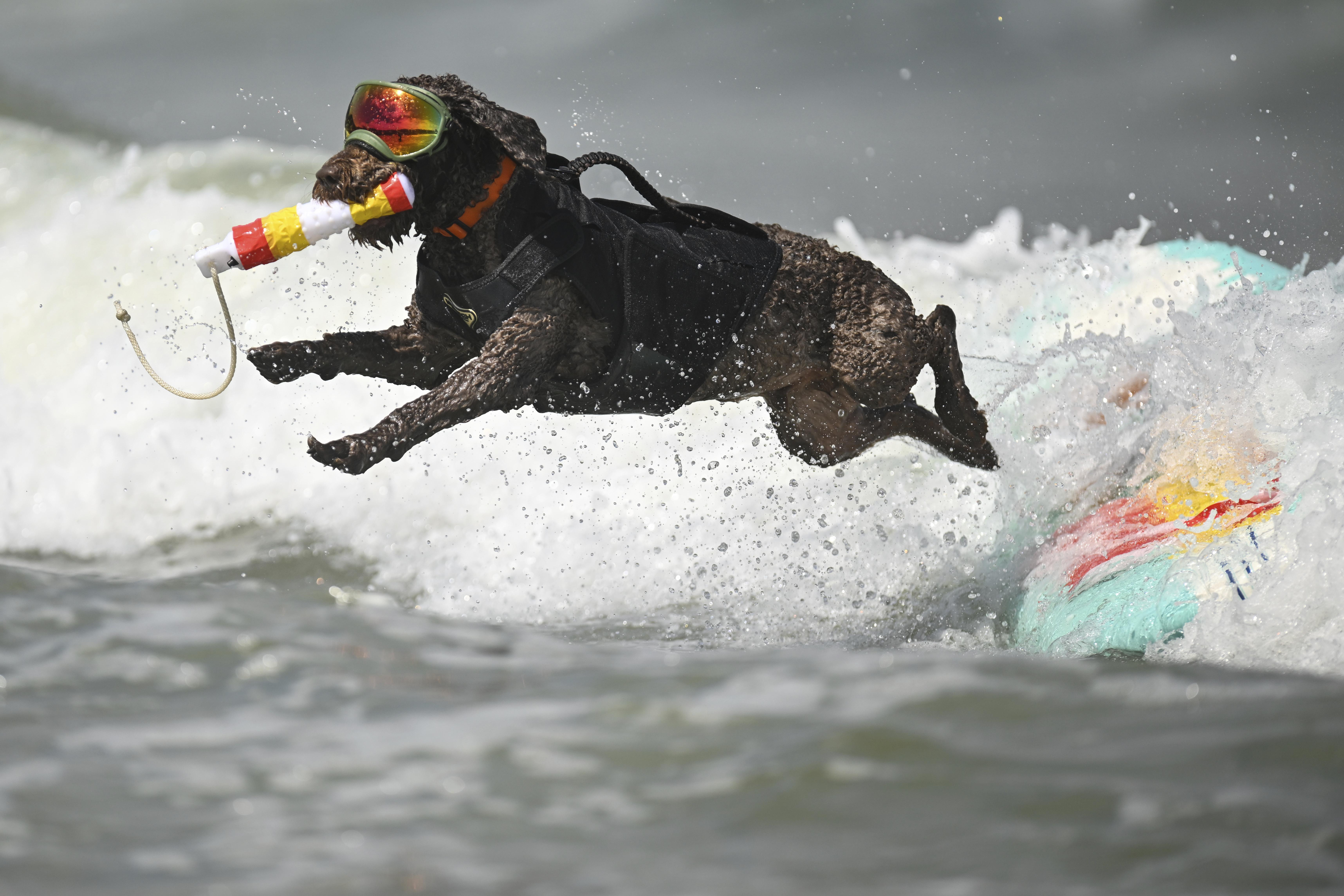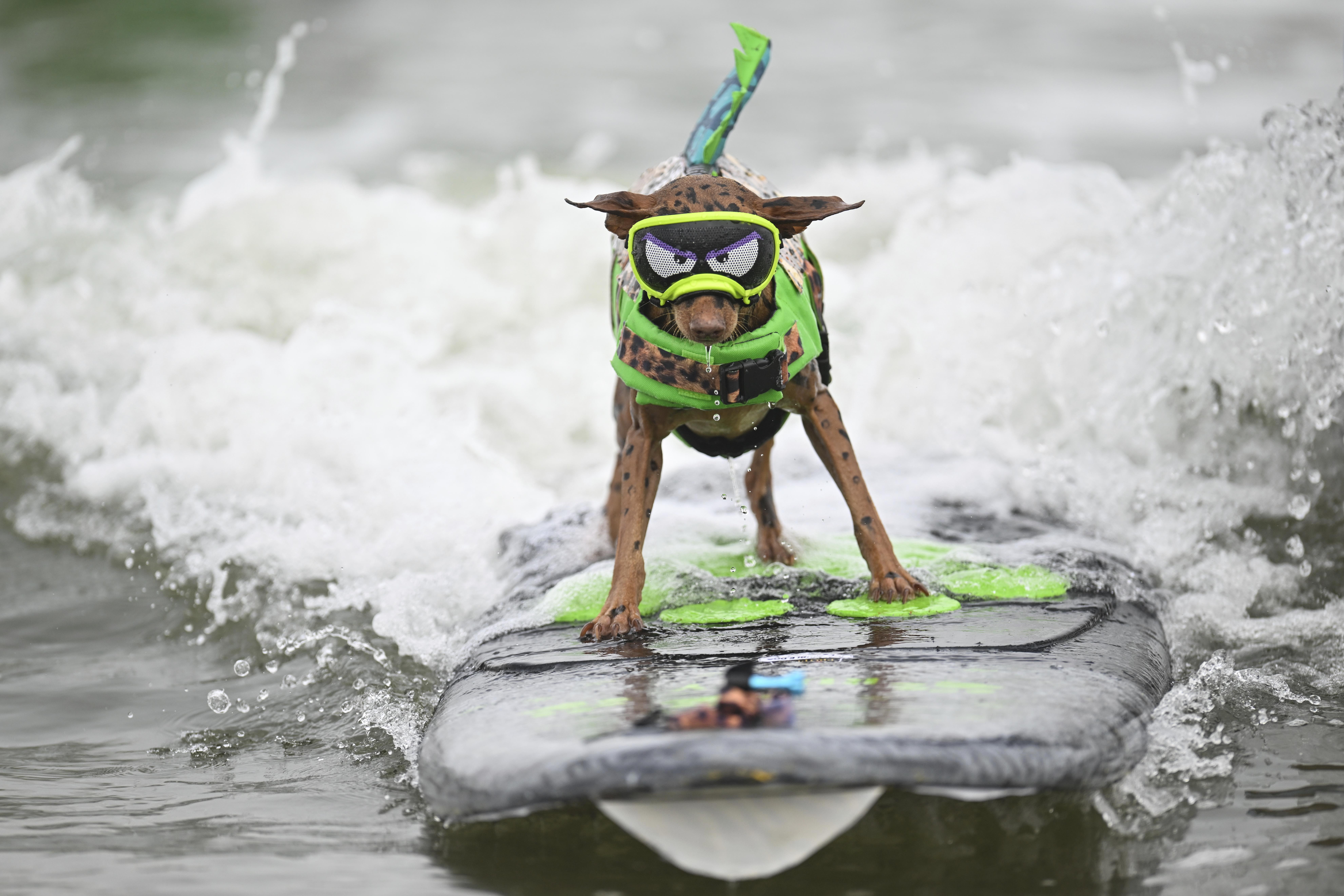 8月3日,在美国加利福尼亚州帕西菲卡,一只参赛犬参加狗狗冲浪比赛。 新华社/美联