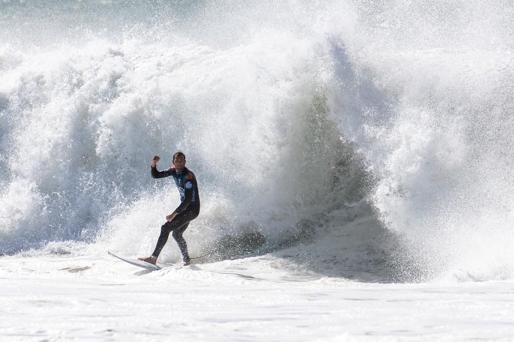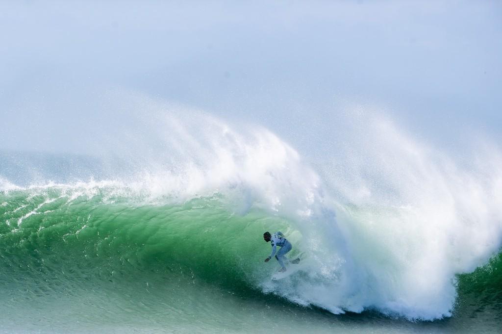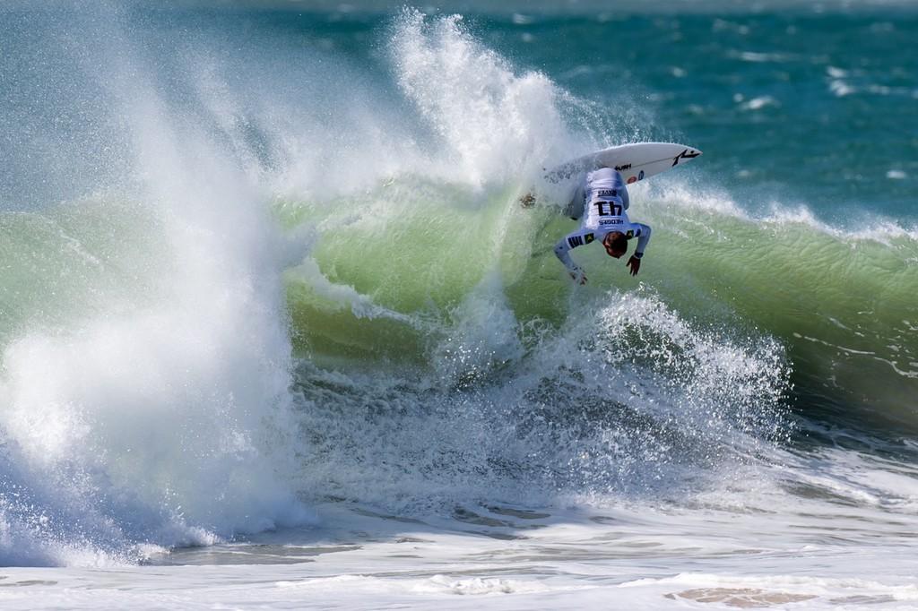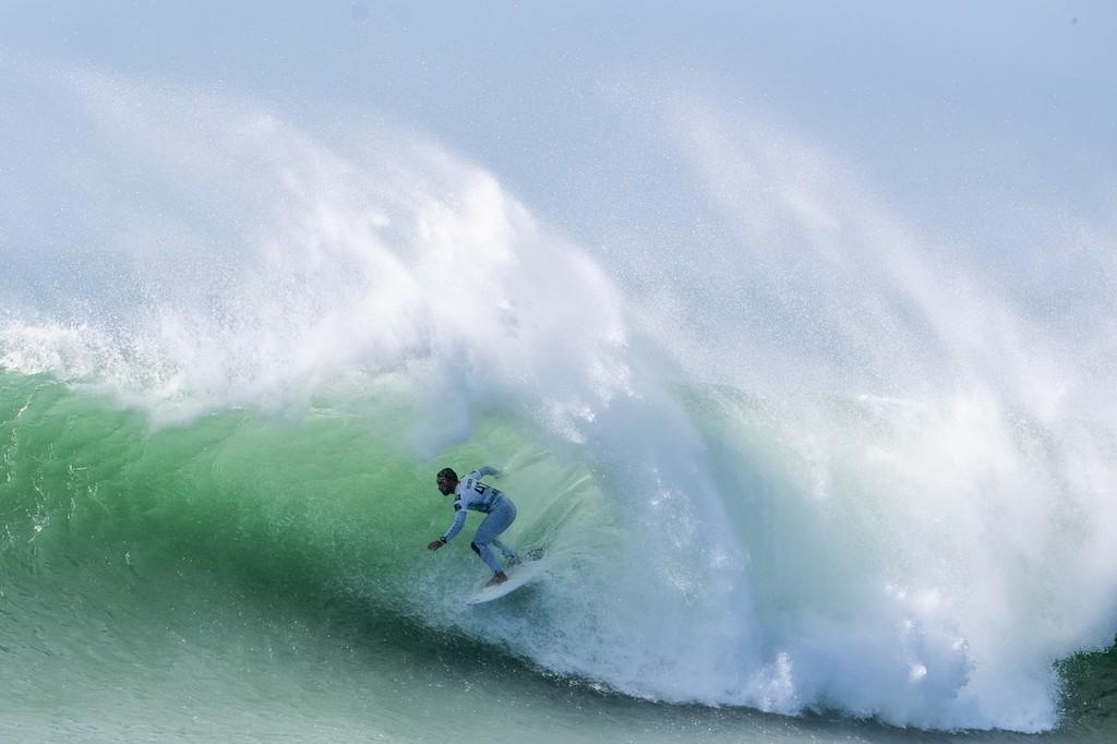 当地时间2022年3月4日,葡萄牙佩尼切,作为世界冲浪联盟(WSL)世界巡回赛的一部分,巴西的Caio Ibelli在Meo Pro葡萄牙冲浪赛事的首轮热身赛中比赛。