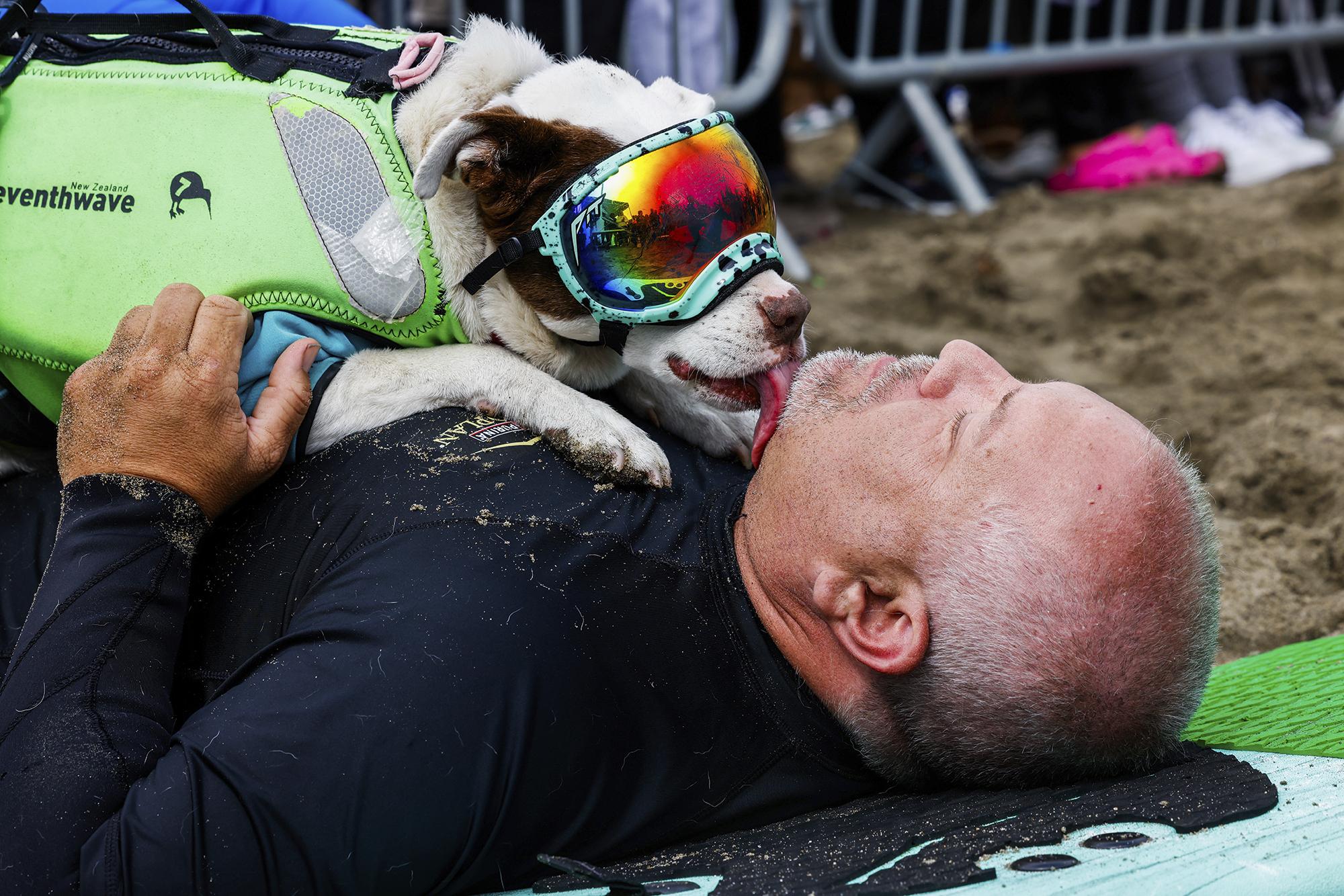 8月3日,在美国加利福尼亚州帕西菲卡,一只参赛犬和主人玩耍。 新华社/美联