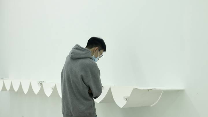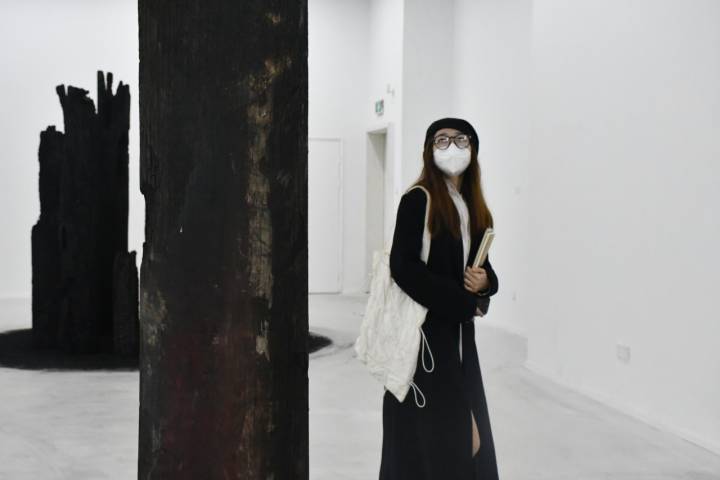 诺大的场馆正中,悄然放置着宁大科院设计艺术学院梅法钗老师的装置新作《彼岸》。白色的展陈背景与作品本身烧成炭色的木头形成鲜明对比,给人以浓厚的历史感与当代性,让不少观展者静默当下、沉浸其中。