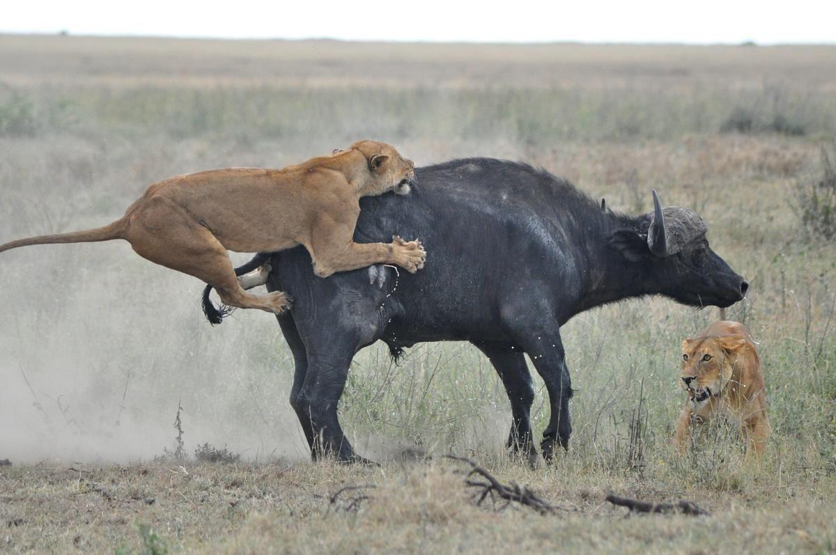 狮子捕猎非洲野水牛