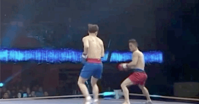 比赛到了第三回合,“君子剑”李明虚晃了一记鞭腿,紧跟着一记爆炸力十足的右手重拳击中对手面门,KO了陈春晖。君子剑七天内贡献两次KO,缔造了中国散打一项前无古人的纪录。