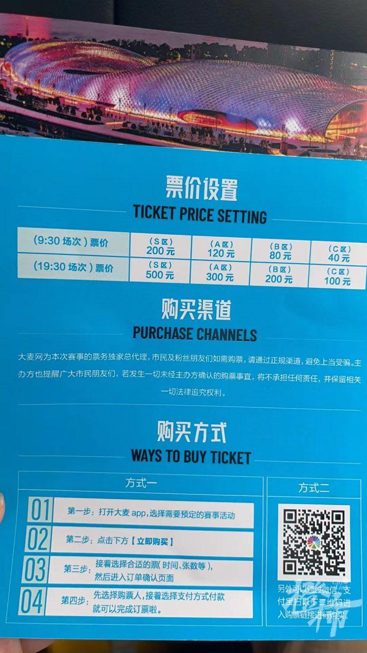 本次赛事的票务分为预赛场和决赛场,预赛场票价分40元、80元、120元、200元四档,决赛场票价分为100元、200元、300元、500元四档,今日中午12点开启售票通道,市民朋友可通过“大麦”App、小程序等购票。